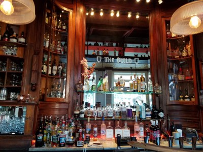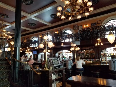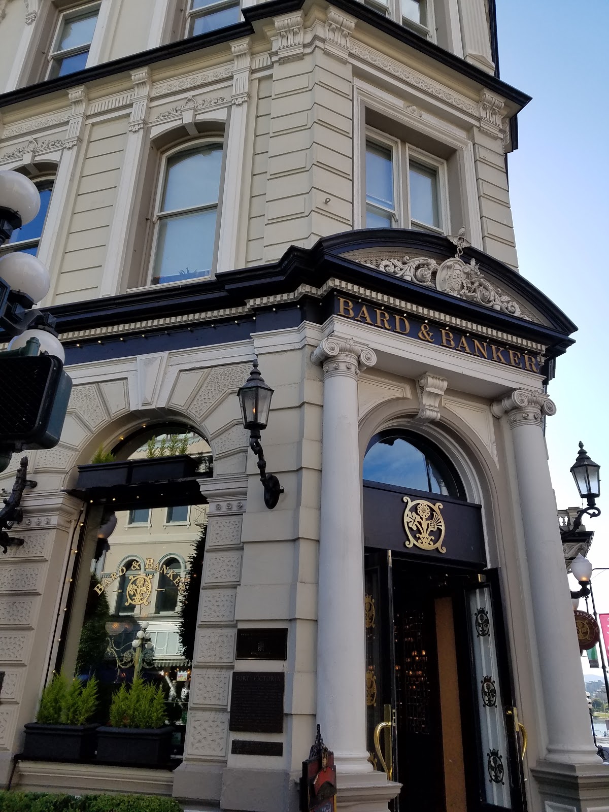 In our sugar coma (which we have not experienced in at least three months), we staggered back to Hotel Rialto, changed out of tea clothes and into pedestrian wear, and ventured out for a tour of Victoria’s pubs. They have several, and we checked them out — Banker and Bard, The Guild, The Iris Pub — all with this incredible architecture and lighting that made the walk from the entrance to the outside porch a beautiful trip.