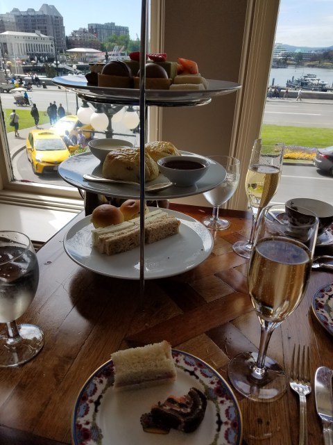We had gone over the moon with the whale watch (previously described by Kim), and we almost canceled the Afternoon Tea at the Empress Hotel because what we REALLY wanted to do was eat some fish n chips at redfishbluefish (that came later), but we agreed we needed to go. So glad we did because it was a wonderful tradition, with delicious little finger sandwiches and bite-size yummies. We, of course, added champagne to ours (making the tea an aside), but there was no way we could possibly finish all of it. The Empress Hotel, even while undergoing renovations, is a beautiful, stately and classy lady, much like the Queen herself, we were not disappointed. The only disappointment: While we didn’t wear heels, gloves, hose and hats, we also didn’t wear sweatpants and flipflops, which we thought were not allowed, and we dressed for the occasion as best we could. Others did not. But there was a grandmother, daughter and granddaughter who were from Victoria who sat next to us, and it was the granddaughter’s first time at The Tea. It was delightful hearing tidbits of their conversation.