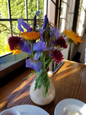 We are staying at Hastings House in Ganges, which is a serene and elegant property located about 14 miles from the harbor in which we landed. We enjoyed an interesting ride with Ben, who was very knowledgeable about the island, having grown up here. I asked him about the flowers and trees that grow here, and he launched into a really good overview — a tree here is highly prized and highly protected, with very hard wood, is sought by artists (and I wish I could remember the name of it!), while the yellow flowers known as Scotch broom are very invasive and were brought here from Europe.