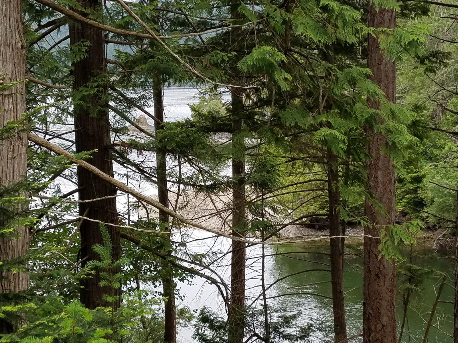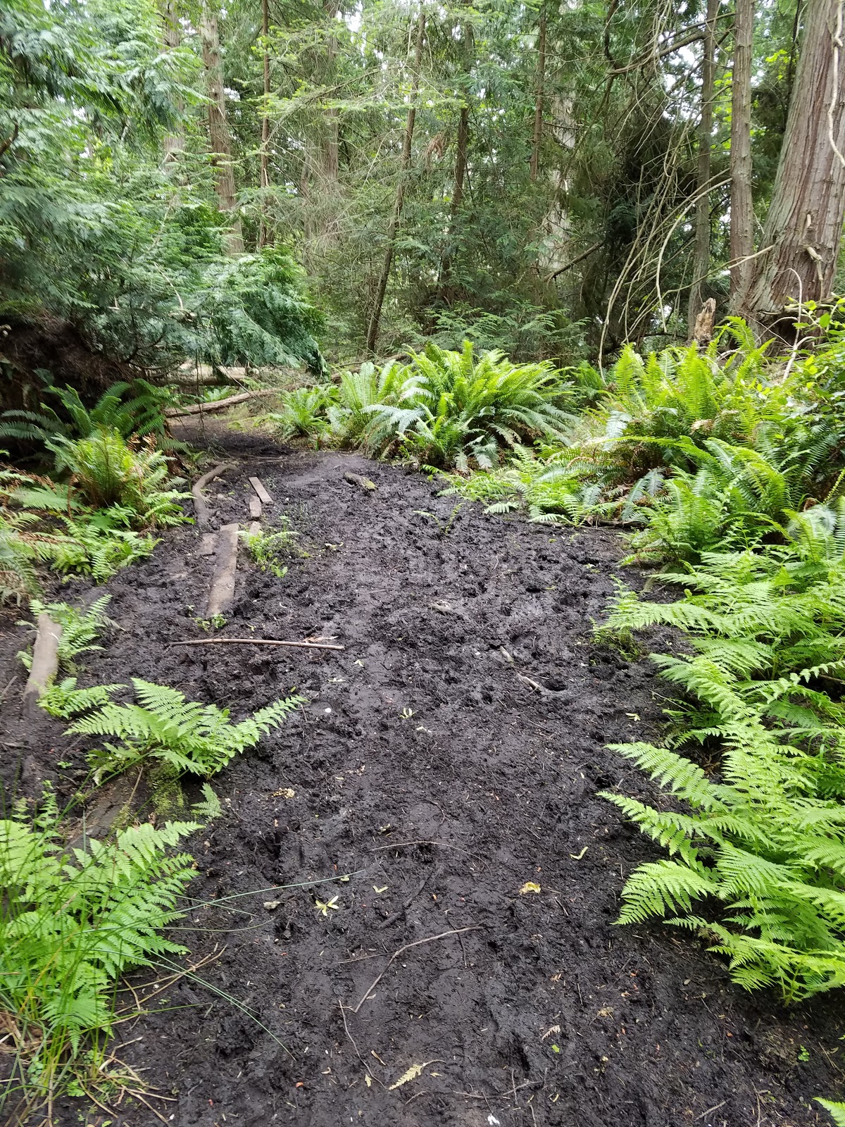 We finally made it to the bottom, and yes, the walk below was incredible. Steady, stable, level and through some beautiful beachside. Which, by the way, in the wet trail areas, featured some of the most luscious black mud I have ever seen. (Gardeners would appreciate that.) Green grass, majestic cedars on either side and that trail of rich, black mud. It was startling in contrast.