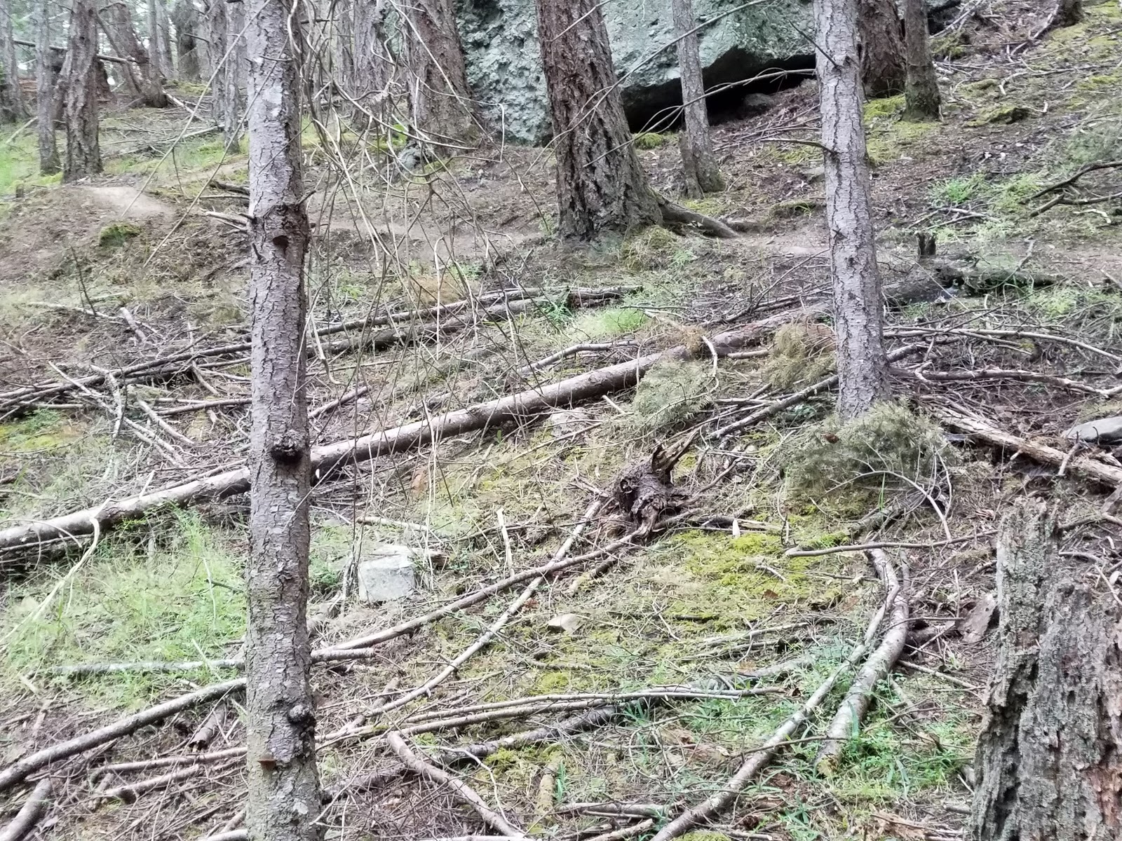 So, we’re meandering along, knowing we have to go back up, and come across this sign with one of those drawings they have in lieu of words. This one showed the hiker falling backwards off three little lines denoting the hillside. Someone had written “Falling Zombies” underneath it.