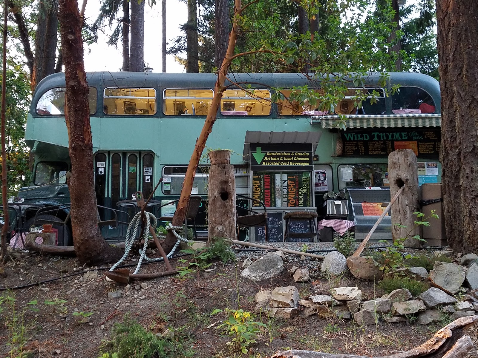 Wild Thyme, a island’s coffee house, is housed in an old English tour bus that had been abandoned in a Canadian mainland junk yard. The owner rescued it, brought it to Saturna, and the residents all joined together to restore it and make this great little cafe, using supplies that were found on the island.