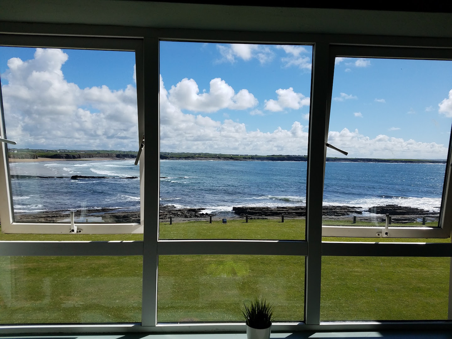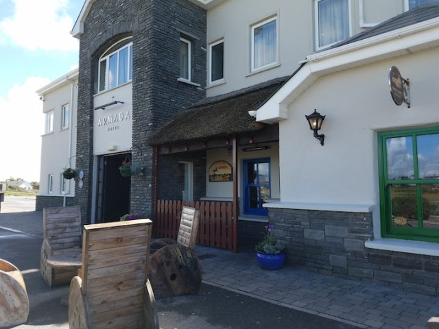 After picking up our car at the Shannon Airport, we managed to navigate the whole thing about driving on the left side of the road, with the wheel on the right. And we got a Ford!! It was a little harrowing, because the roads are so narrow. As the passenger, it feels as thought you are riding in the grass, hitting signs and poles. As the driver, it feels as though there is NO ROOM to pass a car. I wanted to come to a complete stop to let others pass by. We made it to our wonderful hotel, the Armada in Milltown Malby, very close to Quilty and a short drive from Kilkee and the Kilkee Cliffs, which we walked — and it was breathtaking! Photos of that below. What a wonderful first day!