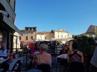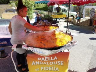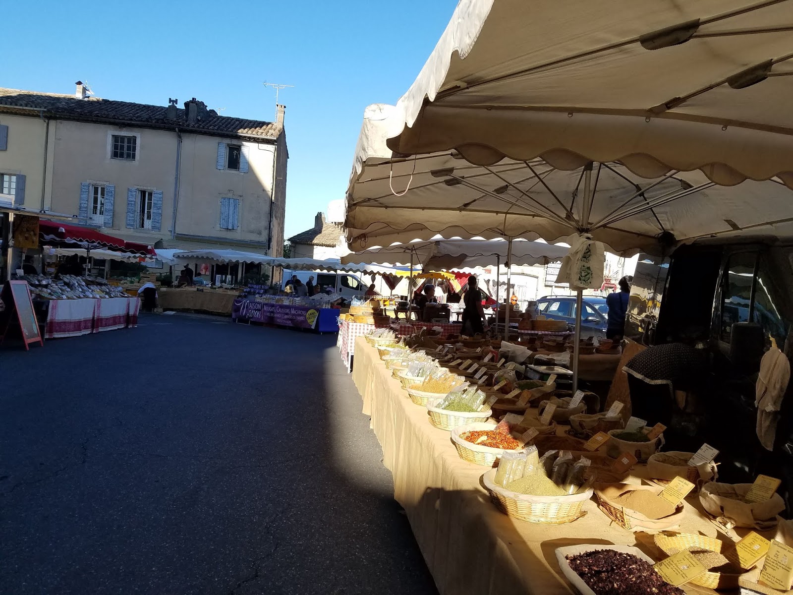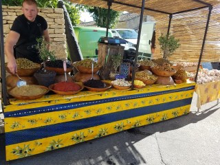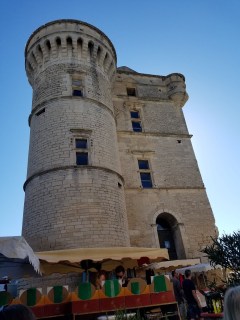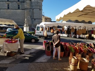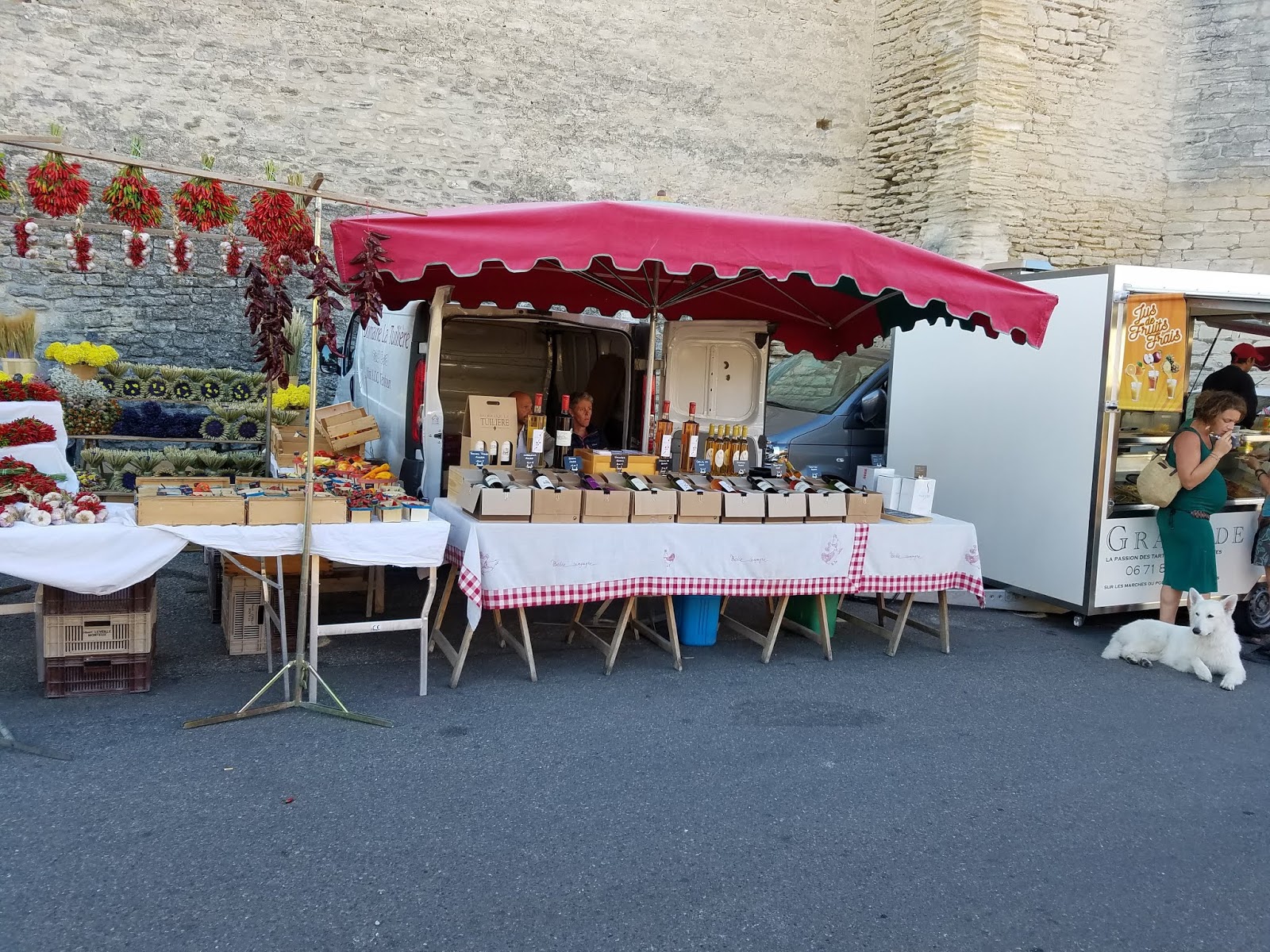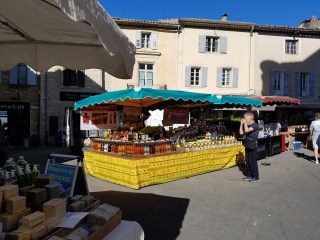 On Tuesday, we visited the Gordes for Market Day and had so much fun. There were stalls selling everything: cheese, wine, spices, sausages, hats, tablecloths, dishes, clothes, scarves….just everything. Betsy bought a great summer dress, a tablecloth for our apartment and a few other items. I picked up some jars of marinade/dips to take back to Nashville.
