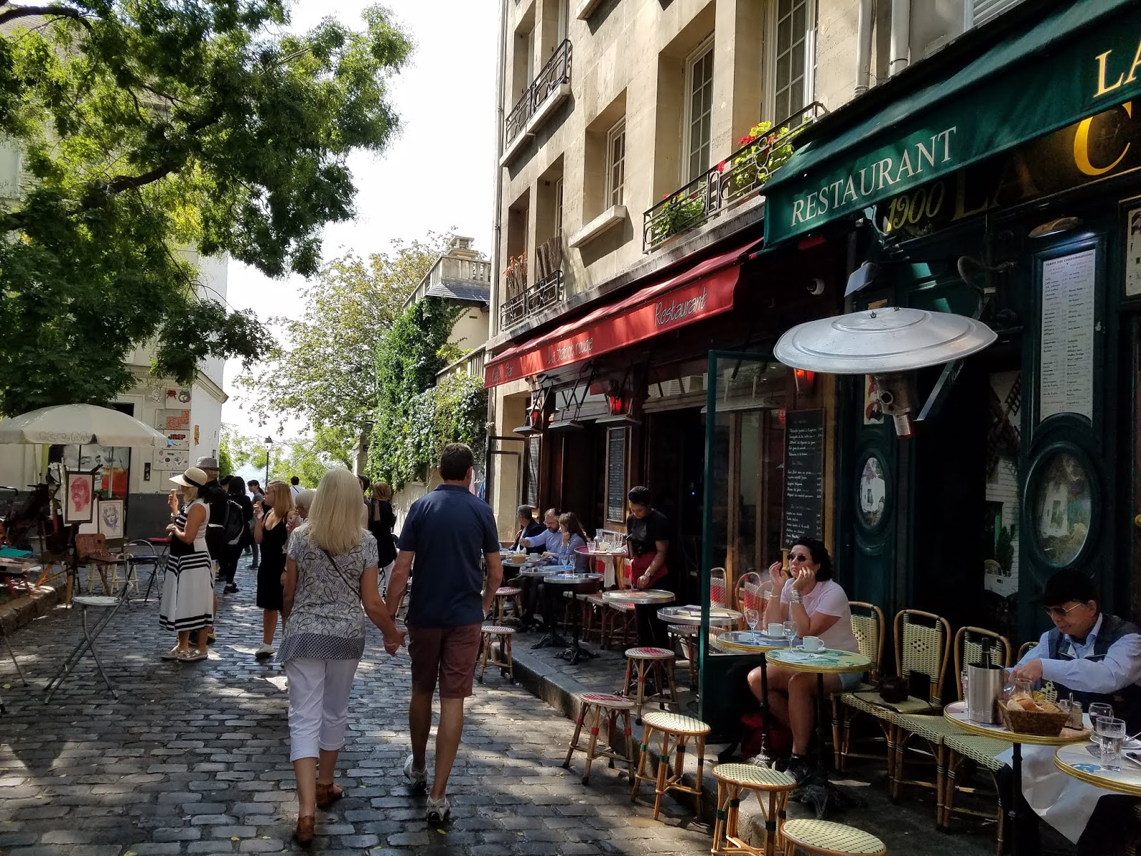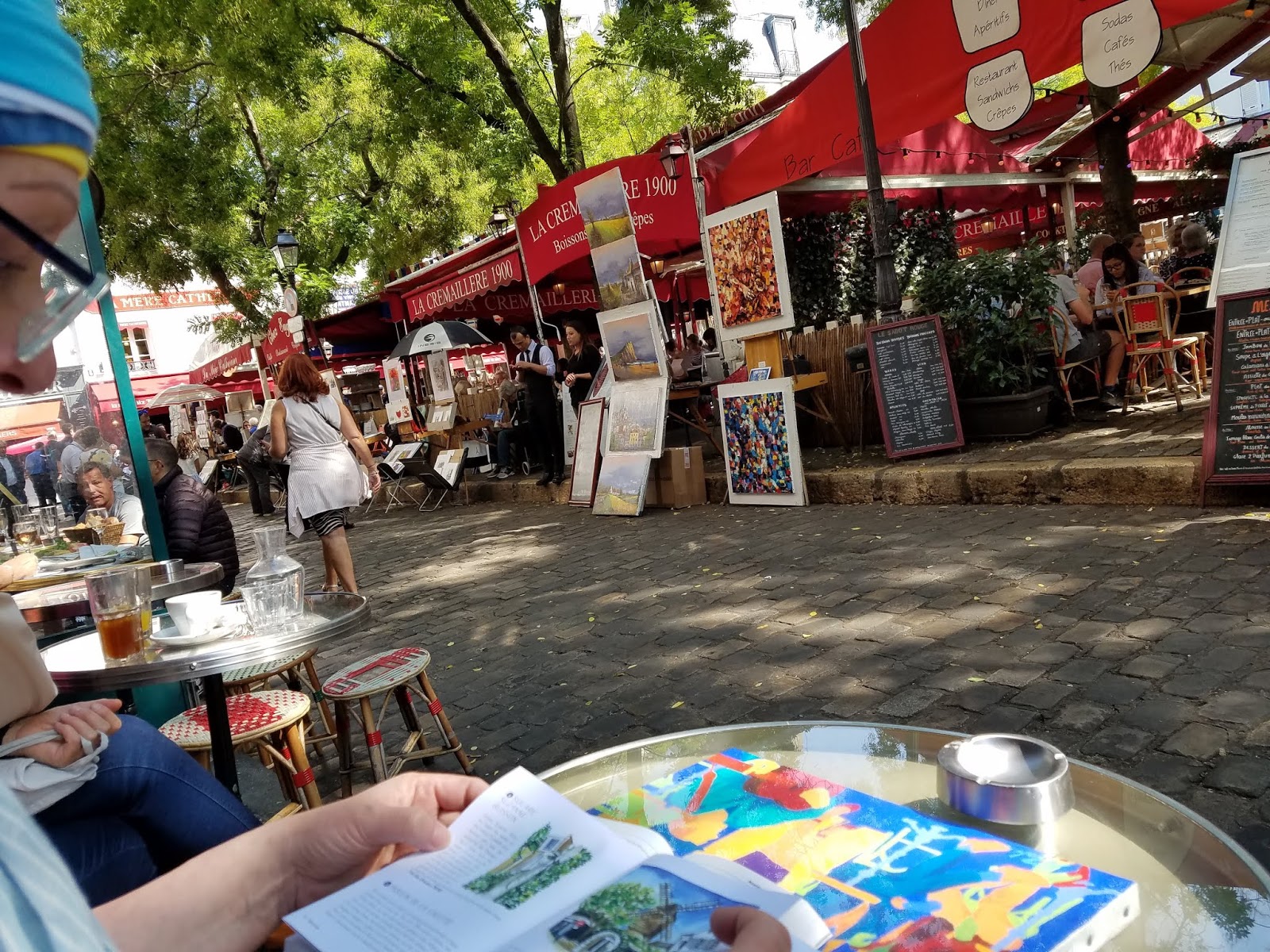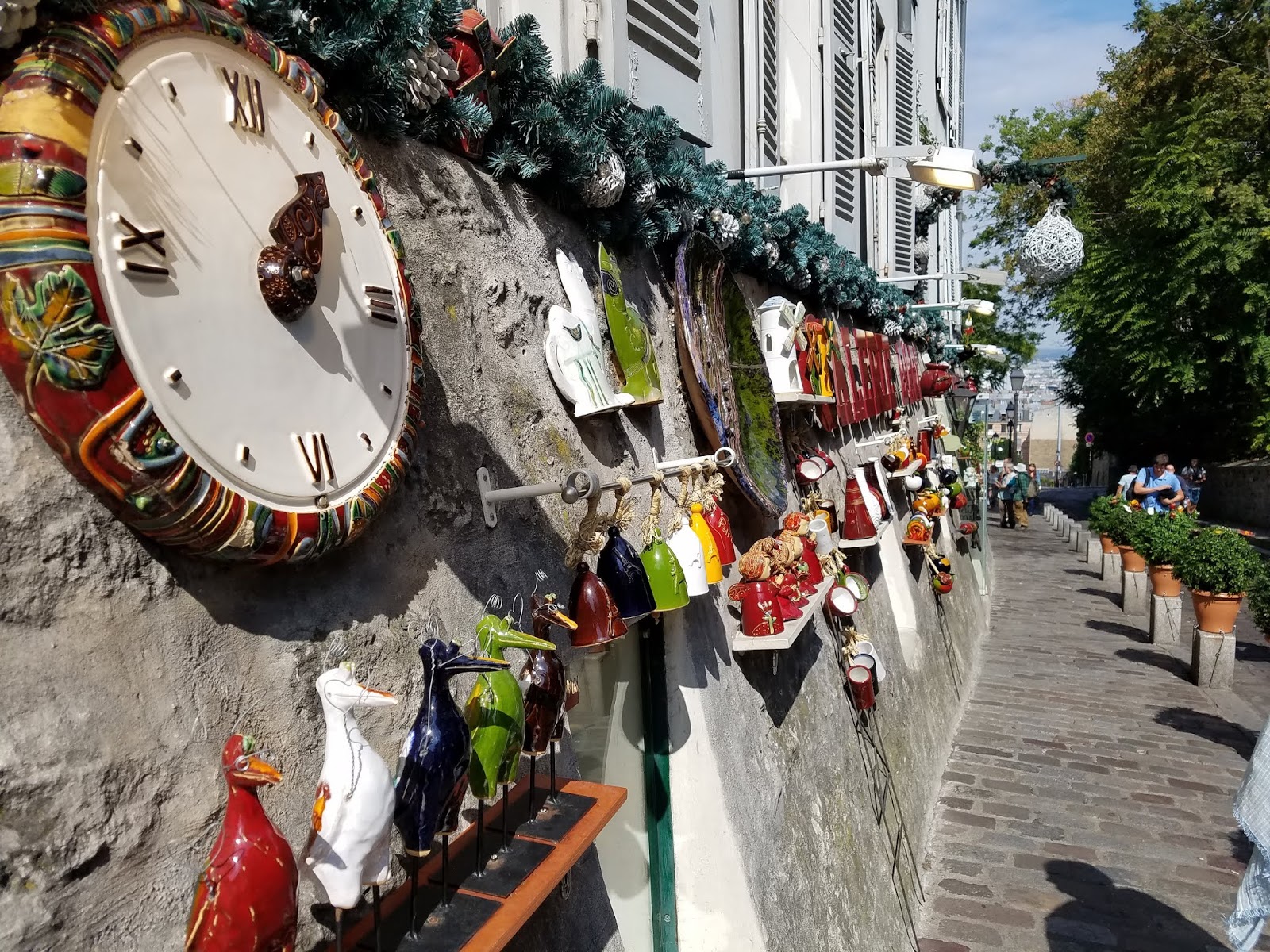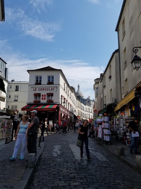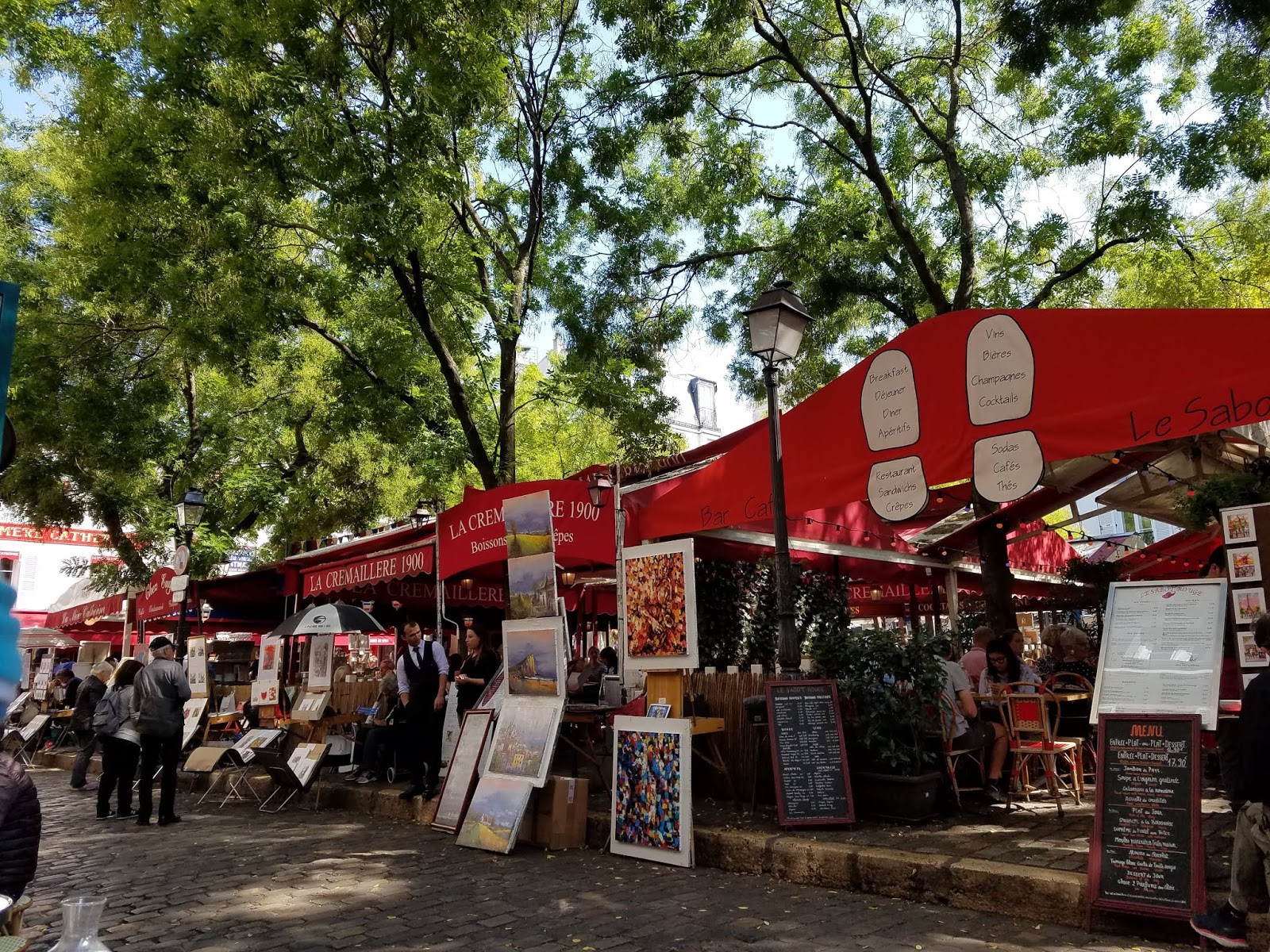 Montmarte was once ground zero for Bohemian culture. While Prohibition swept Paris, wine flowed freely in Montmarte. Painters, performers and others were attracted to the city and its cafes and festivals and dance halls. Renoir, Van Gogh and Picasso roamed these streets, lived here and painted here. We saw numerous artists walking around with sketchbooks seeking customers. We also saw some very good artwork on display or underway.