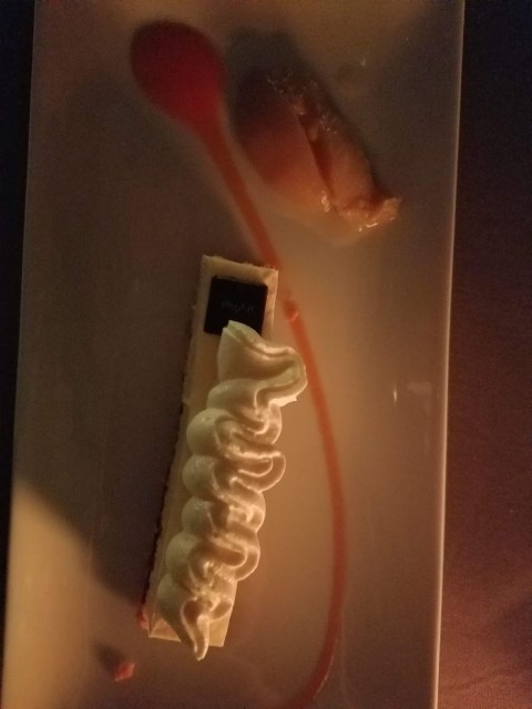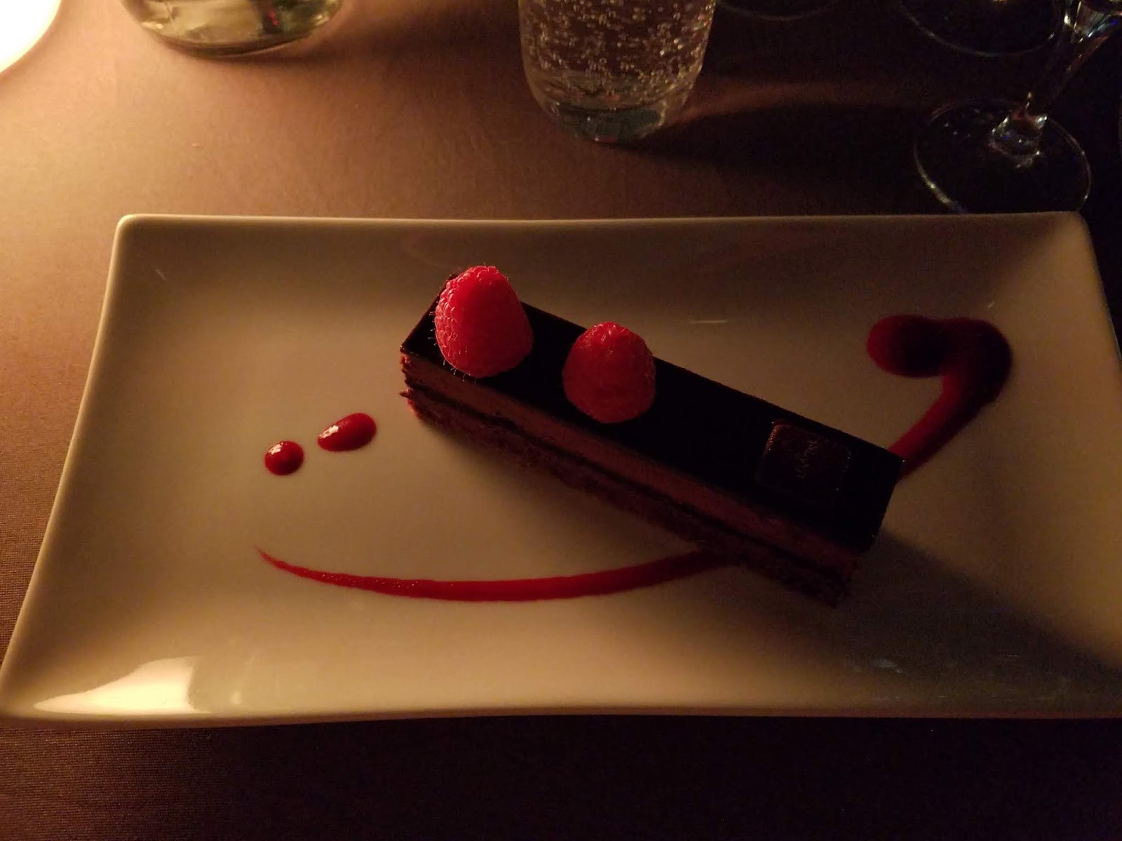 The dinner, however, was exceptional. Betsy had some sort of crab appetizer and I had salmon. Her dinner was Sea Bass and mine was beef. We both skipped the cheese course and went straight to dessert, which was fantastic.