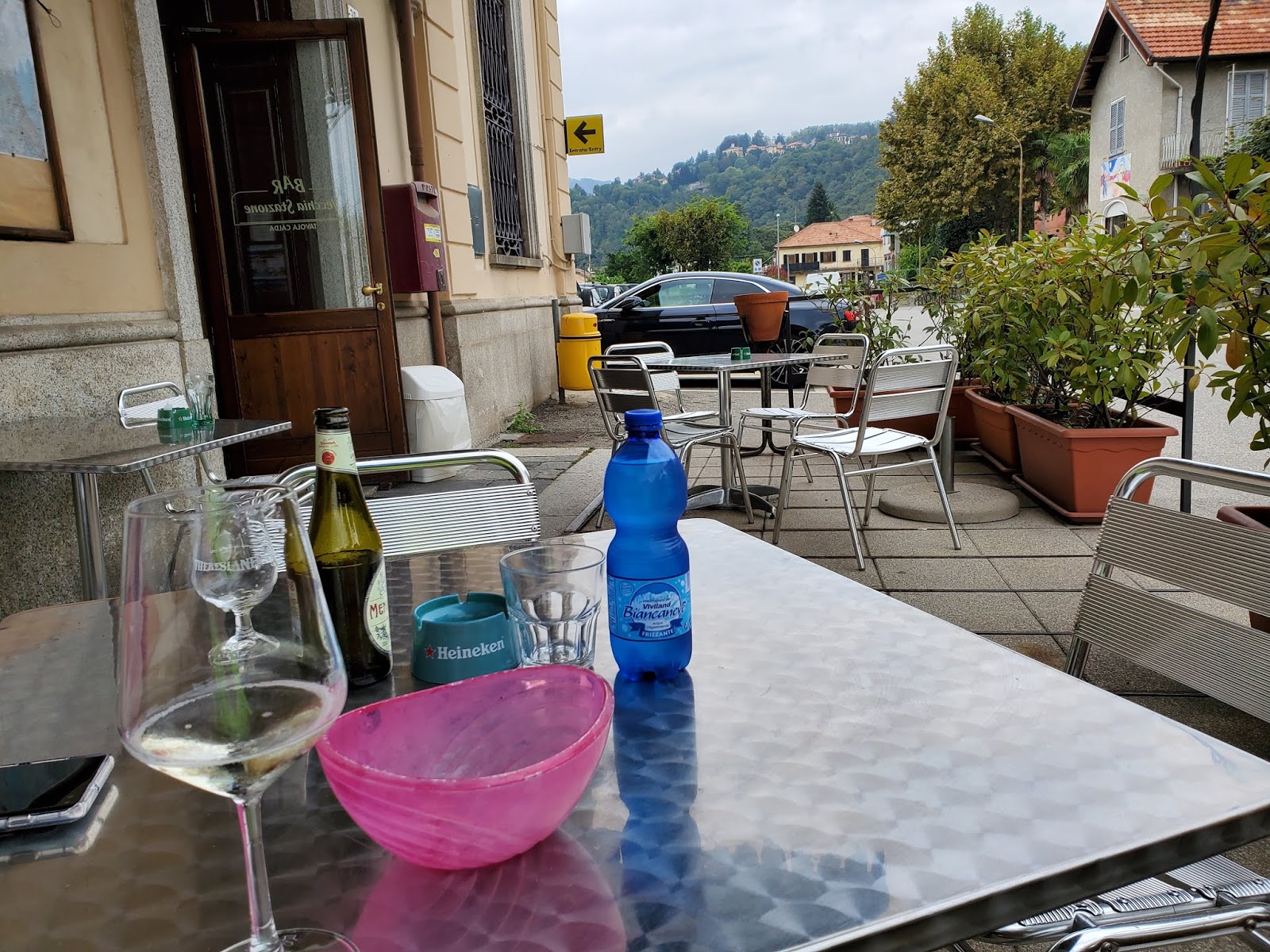 We took a rare break and had a drink other than water as our walk neared its destination. When you order drinks here, they always bring some potato chips. It doesn’t matter if it’s a super nice bar or a bar at a train station, like this one. Having had only breakfast and splitting a small Kind bar for the day, we were glad to see the bowl of chips arrive.