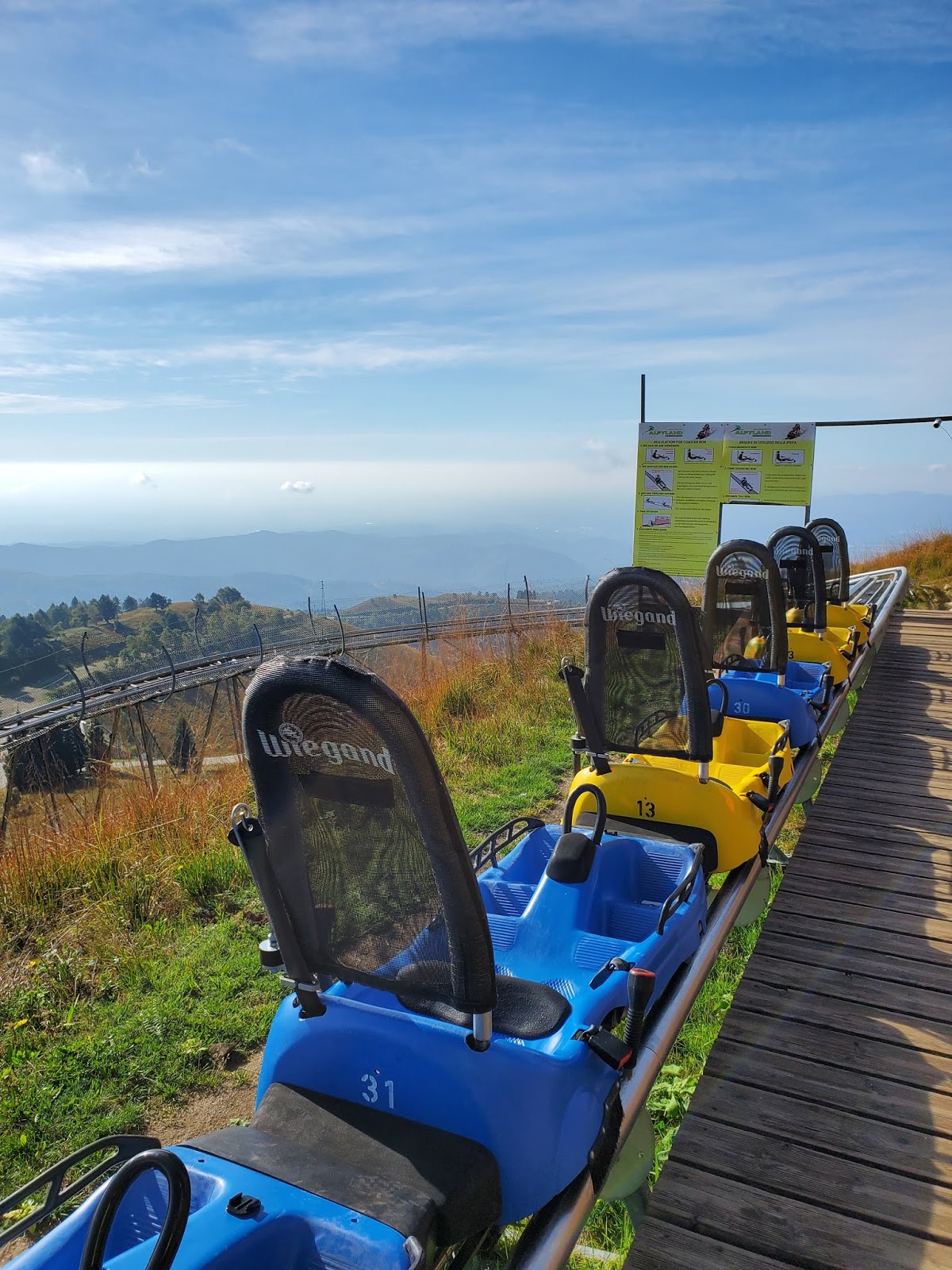 We walked back up to the top of the mountain. The views were better because it was a clearer day. But, that’s not what made us decide to do an extra uphill climb. It was Alpyland that beckoned. We wanted to experience the thrill of the bobsled/roller coaster again. So, we bought tickets for two rides and down we went. It was so much fun. Especially the second time when we were brave enough to go much faster.