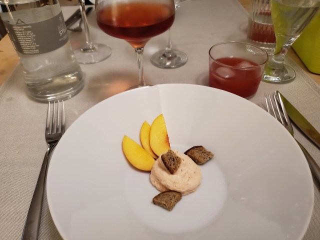 We walked up the street to find a little dinner spot, and found something small, oddly decorated, but with good food. Didn’t love this salmon mouse (below) so much, but the peach slices were a treat.