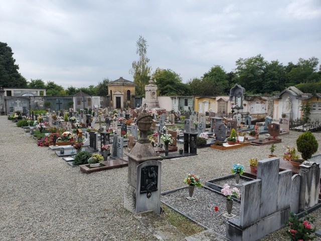 A cemetery behind a church. Very pretty and lots of flowers.