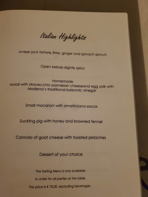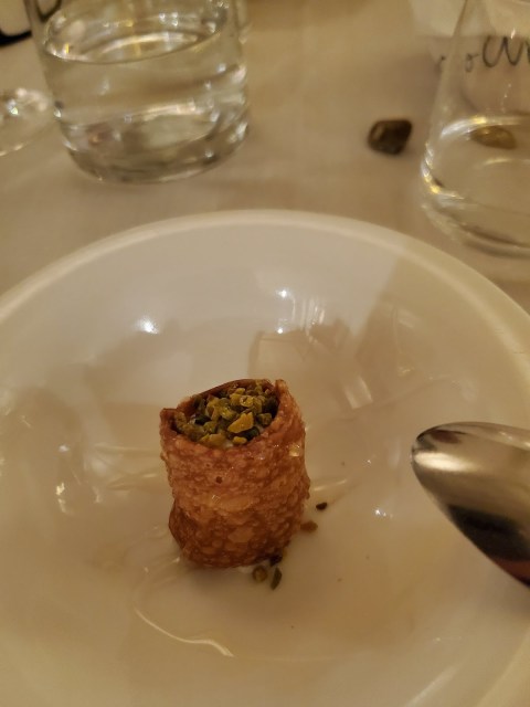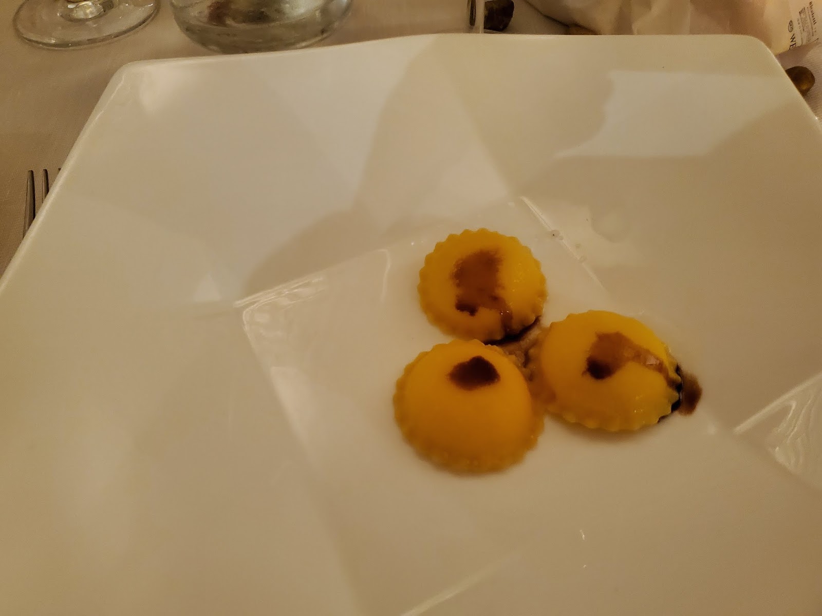 Even though this was such a small bite, we couldn’t eat it. Goat cheese in a cannelloni. We tried to cancel this dish, but the chef had already prepared it. We didn’t eat it. |