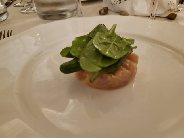 Raw amberjack with ginger and lime and spinach on top. This was such a clean and delicious bite. |
