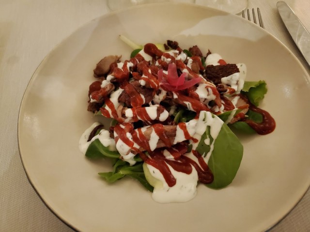 Open kebob: We’re not sure what this was, but it was so delicious. Maybe lamb? Yogurt sauce? Definitely had pickled onions, which we both love. And some kind of slightly spicy sauce. |