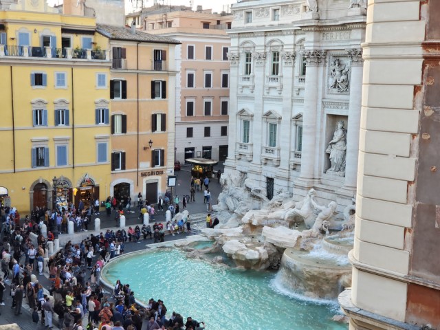 But, the words “rooftop cocktails” pierced through the din. Betsy and I stopped in our tracks and looked at the man inviting us to enjoy the cocktail bar on the roof just across from the Trevi Fountain. Really? We were skeptical. But we followed Daniel,  through a side door, down an empty hall, onto an elevator and then up and down some steps and through an empty dining room. I was certain we were being duped by then. I was wrong. We stepped out onto a small rooftop area with a quaint bar and an incredible view of the Trevi Fountain. It felt like discovering a secret gem in the city.