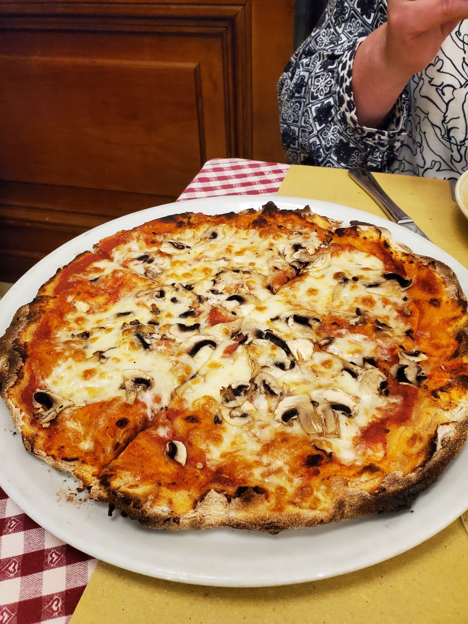 For dinner, we walked half a block from our hotel to a small restaurant complete with red and white checked tablecloths. We each ordered a salad and shared a perfect, thin crust mushroom pizza.