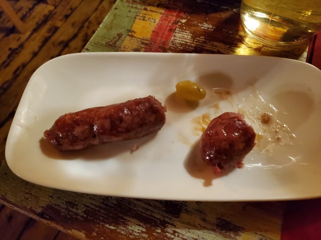 The food was fantastic and there was so much of it. First bread and cheese, then breads with pate and melted cheese and onions and a whole sautéed mushroom, then the best lentil soup we’ve ever had, then a ricotta and polenta croquette (yes, fried cheese), then sausages and roasted green grapes, then a grilled wild boar rib and some spinach-filled pastry. Pasta was supposed to be next, but we declined. Then out came tiramisu that was a like cloud.