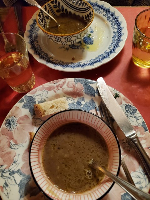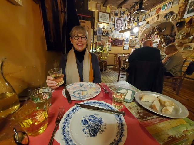 After looking in the windows of several restaurants, Betsy picked out one she said looked warm and welcoming. We walked in and just two people were dining and they were engaged in an energetic conversation led by the owner. He told us it was prix fix dinner beginning with starters then soup, meat and finishing with pasta. It sounded like a lot of food, but we decided to chance it.
