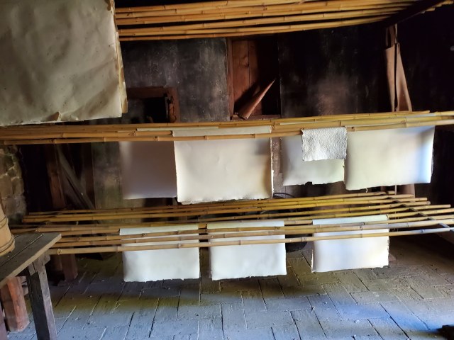 Then the magic happened. We were walking up a small alley and came across a shop. A sign explained it was a shop that made paper in the old traditional way. Betsy peeked inside. I cautioned her not to go in since no one appeared to be there.