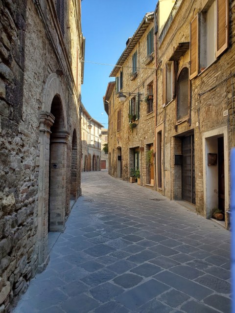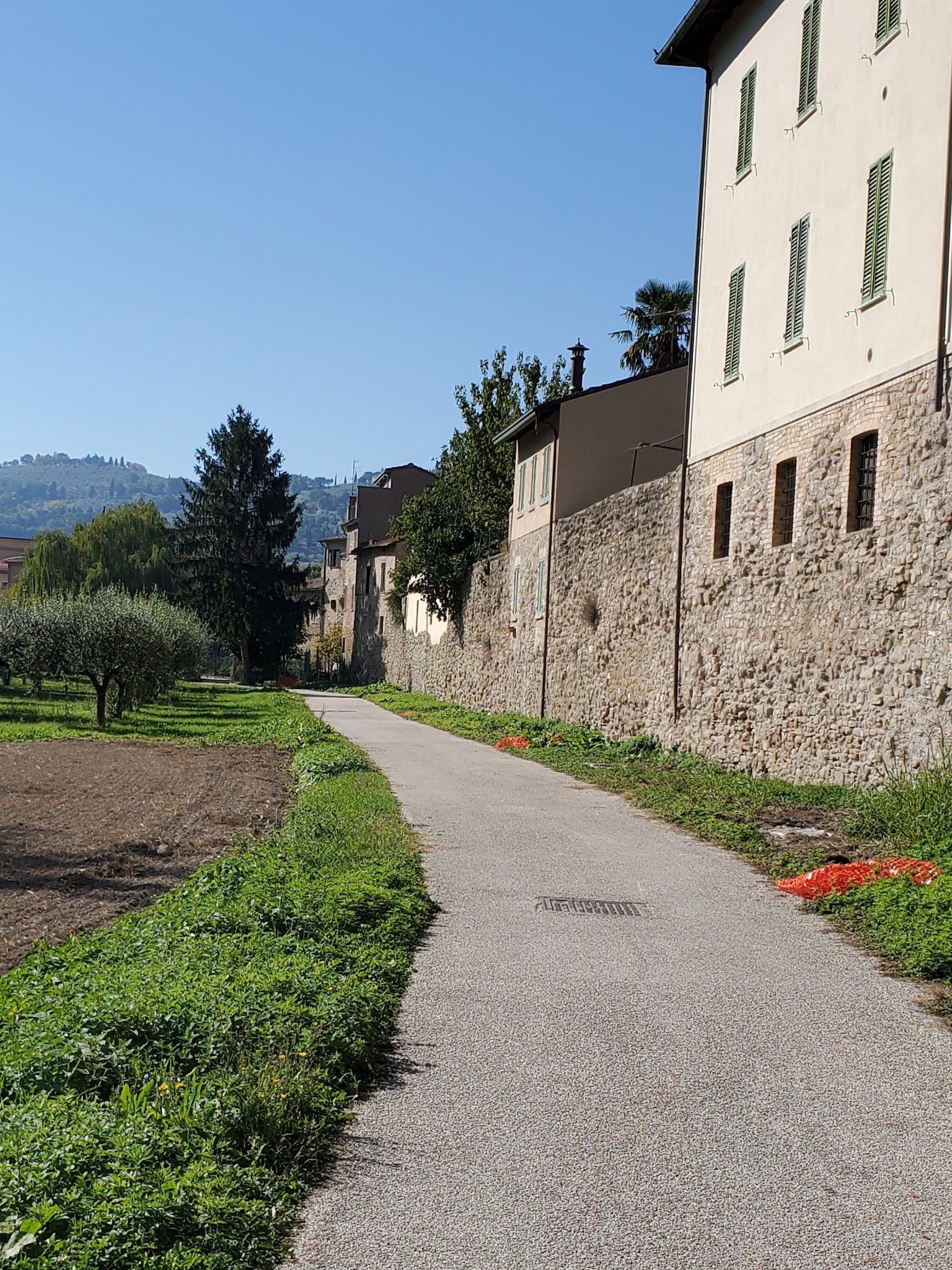 We had an easy approximately 7 mile walk from Montefalco to Bevagna. No steep ascents or descents on this one, just walking along a paved road for a while, then on a white road and then a paved bike path before entering the city walls. The weather was fantastic and we felt good from a day of rest. Wearing clean hiking clothes thanks to the availability of the laundromat was a bonus.