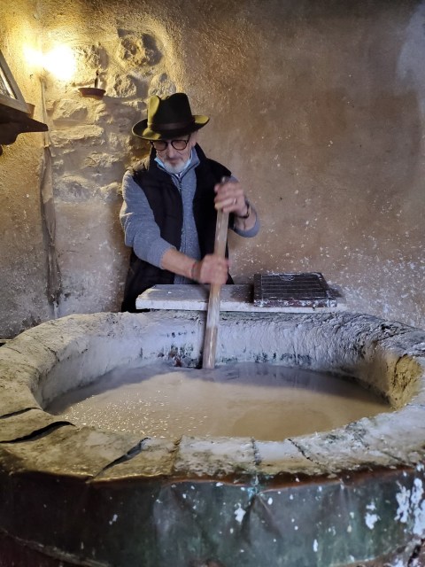 She ignored me and that was a good thing. I often lean toward caution while she is bold. In she went and her instincts paid off. Betsy heard someone whistling in the loft upstairs and she called out and suddenly we were meeting Master Papermaker Francesco Proietti. He spoke no English and we speak no Italian, but somehow we communicated and he showed us his paper making process.