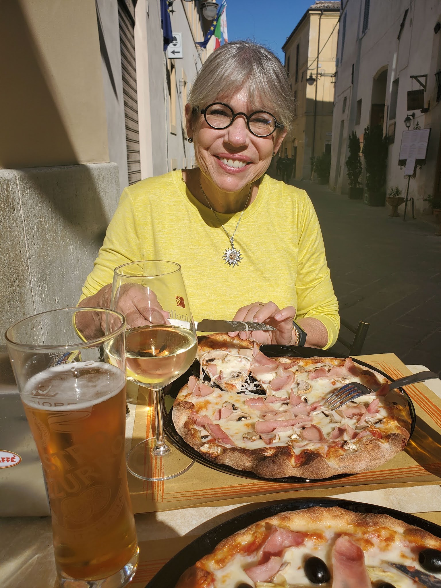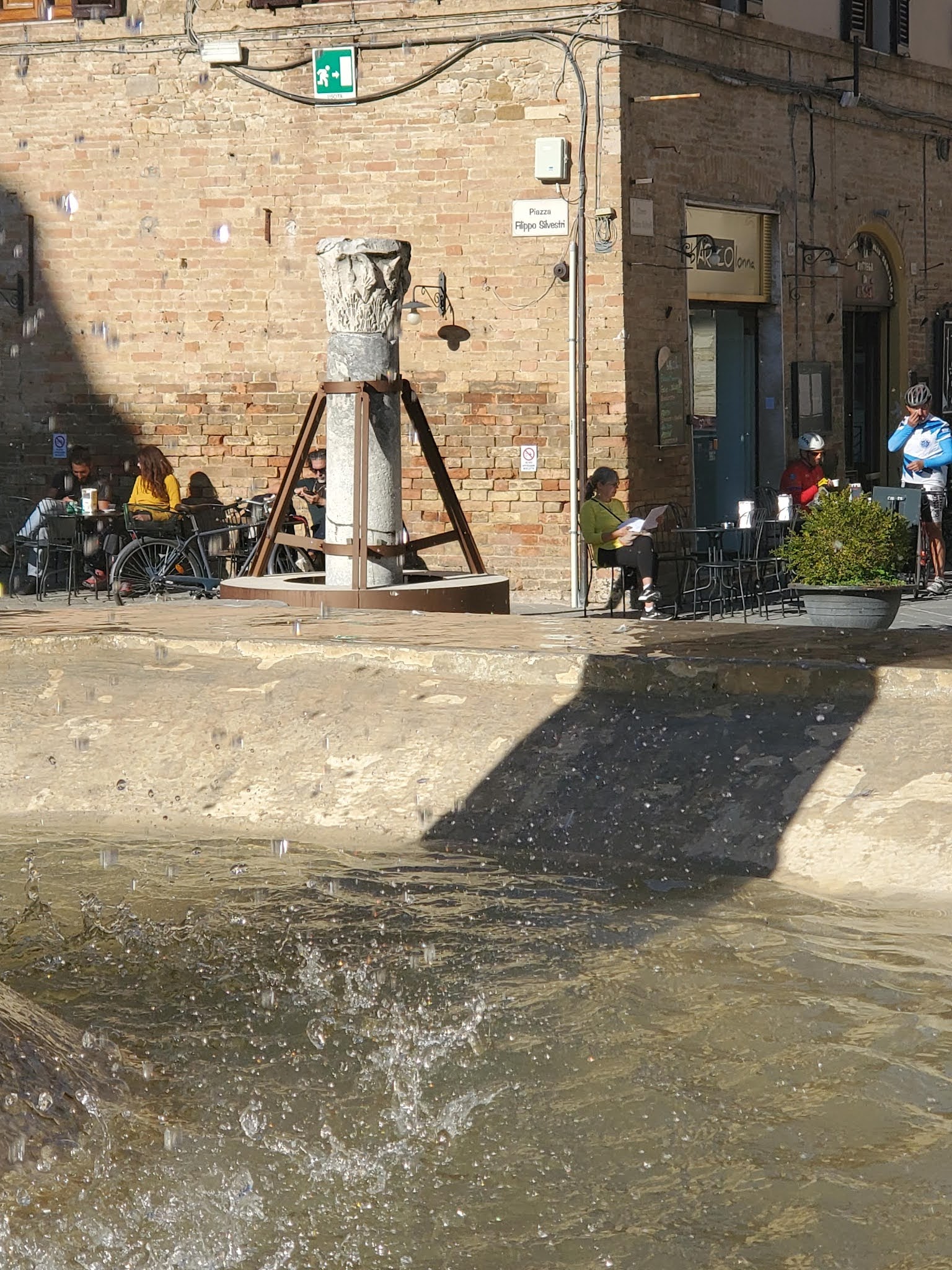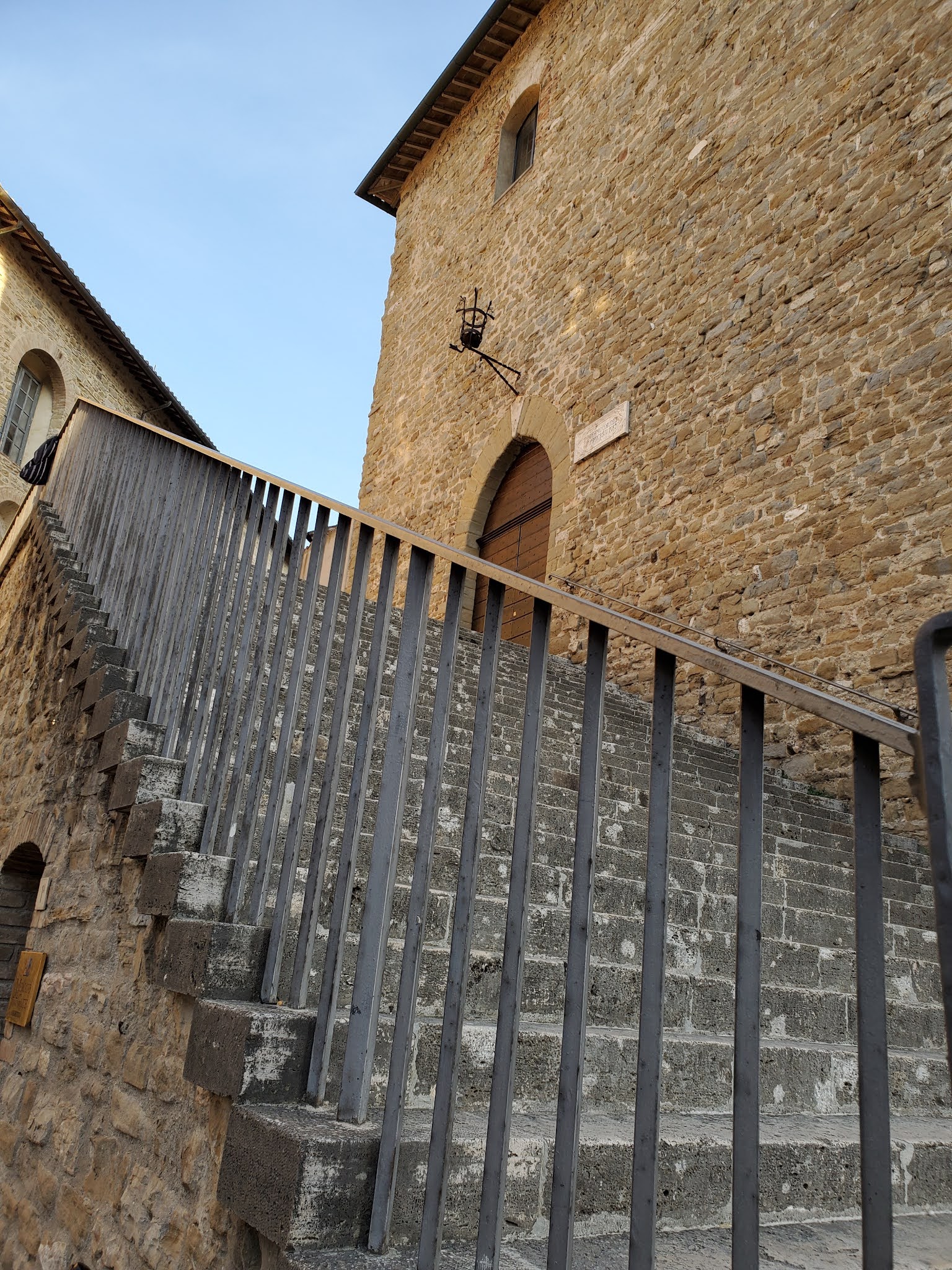 We found another outdoor cafe to take a seat and have a glass of wine and watch the people from the town gather and visit and then move on. We saw children go to music practice and could hear a trumpet playing scales not long after they entered. We watched a group of about 20 people have a meeting in the piazza and it was clear they were talking about planning an event. We chatted with a German couple who were traveling around the area by car.