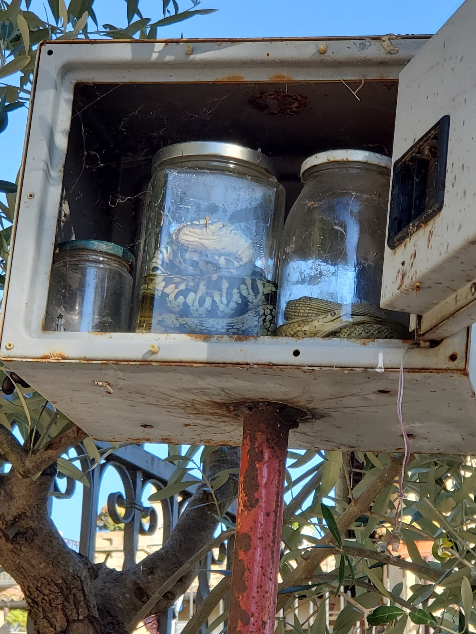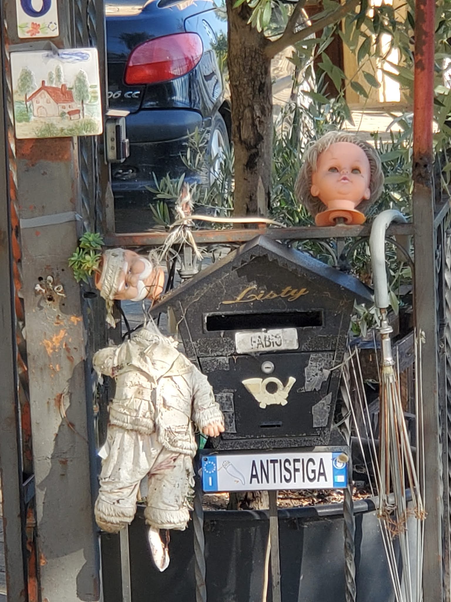 Snakes in jars, doll heads, some kind of scary Santa and there was something dead on a bench that we didn’t photograph. Betsy took the pictures and then we scurried past this Hotel of Horrors. We tried not to imagine what might be on the inside.