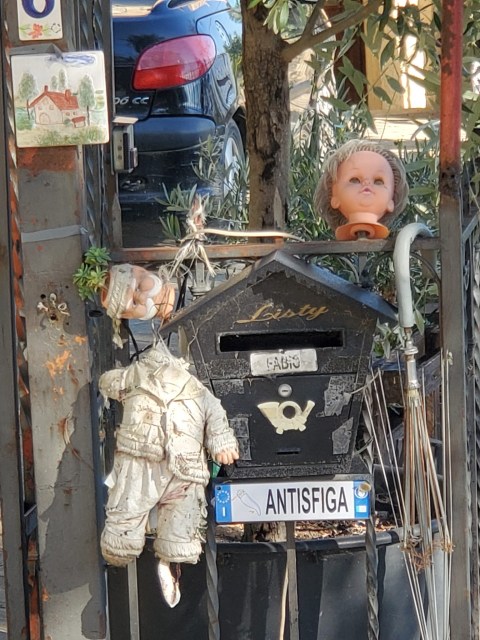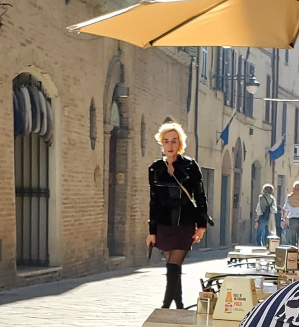 The whole time we were having lunch, there was a strange woman walking back and forth from about our table to the other end of the cafe and then back again. At first, she was wearing a dress and stack shoes, lots of makeup. Then she disappeared for about 10 minutes and was back wearing a black skirt and top and different stack thigh-high stacked boots, still lots of makeup and still walking back and forth in this little area. I said she was the Italian version of Delta Dawn waiting for a man who wouldn’t show. Betsy’s mind went elsewhere, thinking she might be a prostitute. A man did eventually show up and they sat at a table briefly and then left together. So, who knows. It was odd, though.