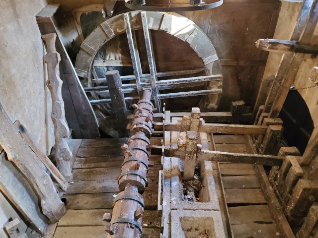 Water turns the wheel and those two logs rise and fall, pounding cloth placed in those troughs with some lime mixture.