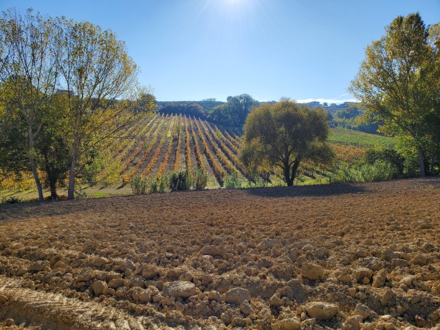 The walk was through farmlands and vineyards and along a river bank. No waymarks, but the directions were clear.
