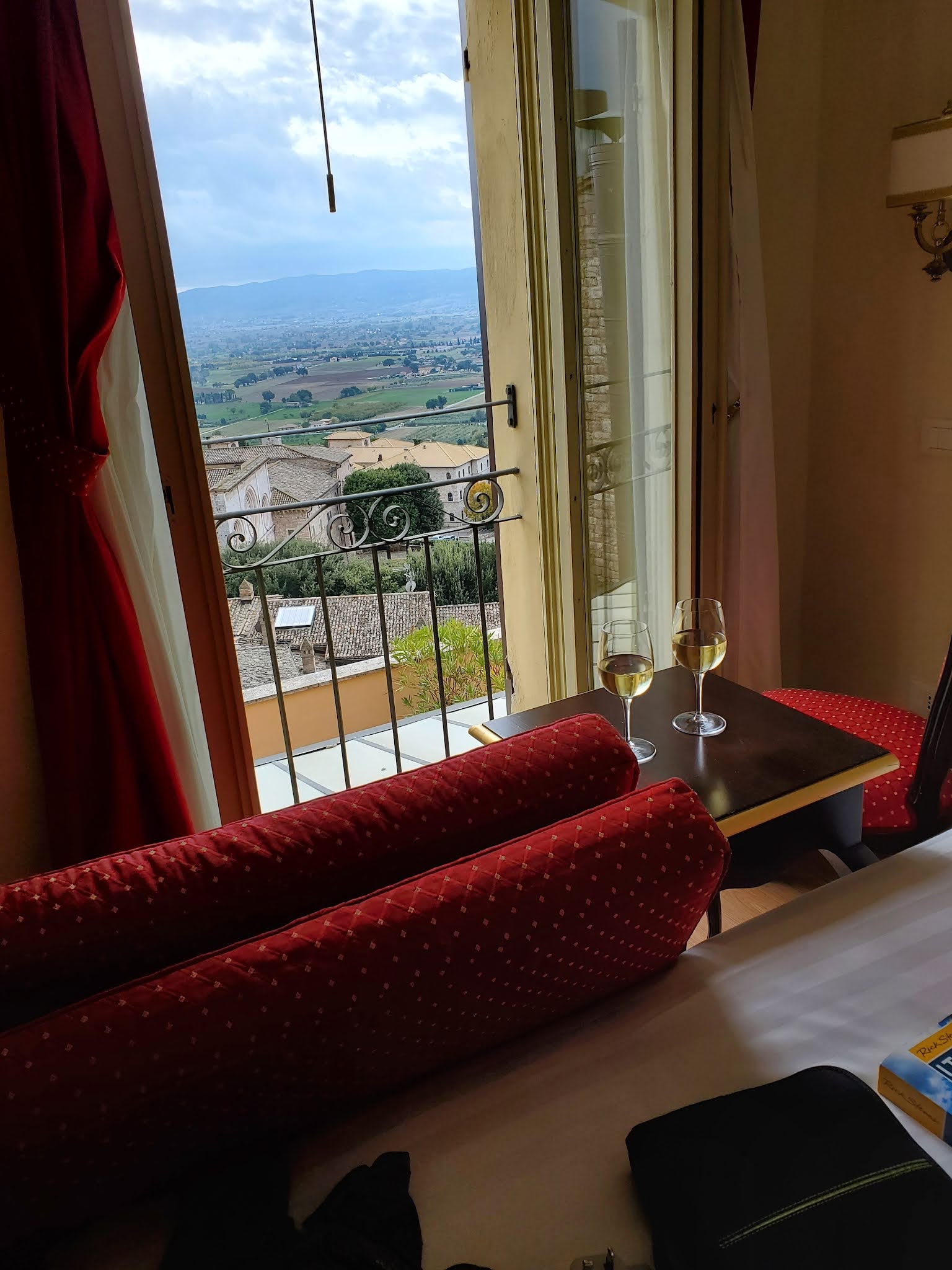 After that, it was back to the room for a bit. We decided to skip lunch and make dinner reservations at a place recommended by Michele and we wanted to be hungry. So, none of those chips and peanuts they bring to your table when you have a glass of wine at a cafe today. We decided to have a glass in our room with our view.