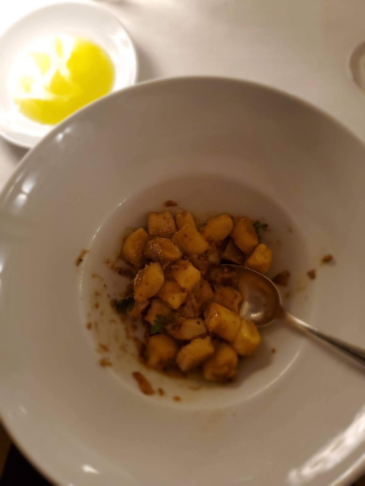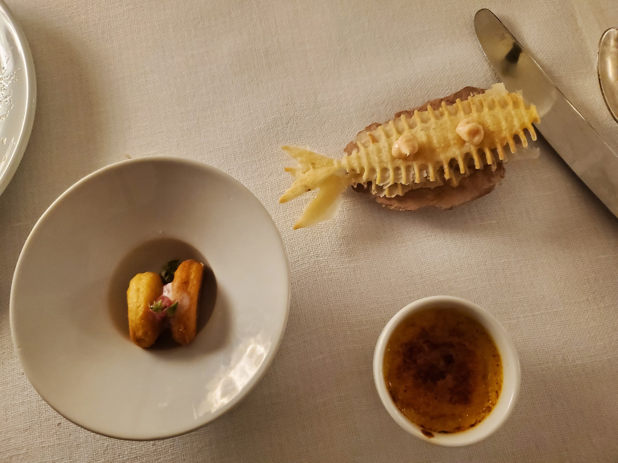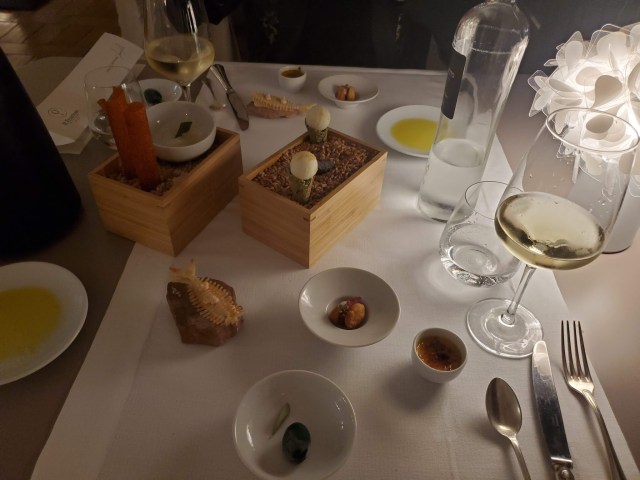 Then we went to dinner at Ristorante iL Frantoio. It was a beautiful spot just a few steps from our hotel. The food was deliciously gourmet, but the real treats were the little surprises the chef served. The amuse bouche included tiny ice cream cones with an olive oil ice cream, not very sweet, topping a savory, garlicky cone. There was a tiny pumpkin creme brulee, just a creamy tablespoon of packed flavor, and a piece of crisp bread, shaped like a fish skeleton, with two small dollops of trout pate, a very thin tuile of spicy red pepper and a couple of other items designed to fool the eye and the palate.