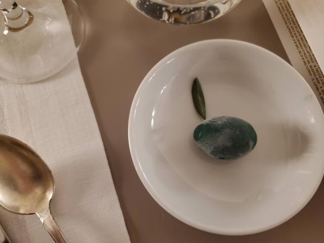 It looked like an olive, but it was filled with a flavored olive oil that spilled out when the shell was broken. It is meant to be a substitute for butter on bread.