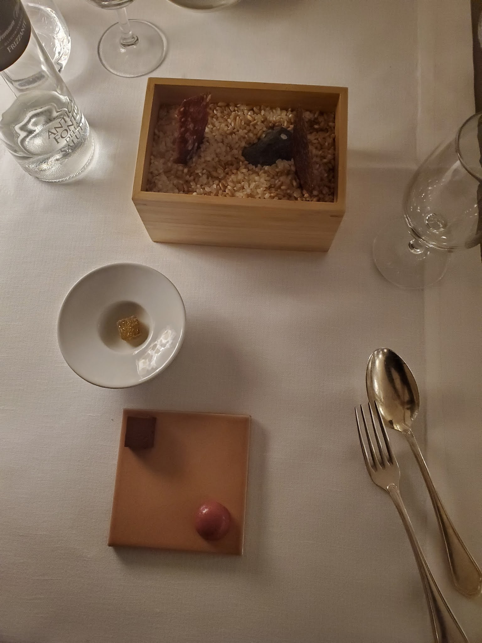 After we ordered a dessert to split, they surprised again with pre-dessert treats. Just some tiny bites of chocolate, raspberry, chile and some kind of sweet olive oil gummy that defies description.