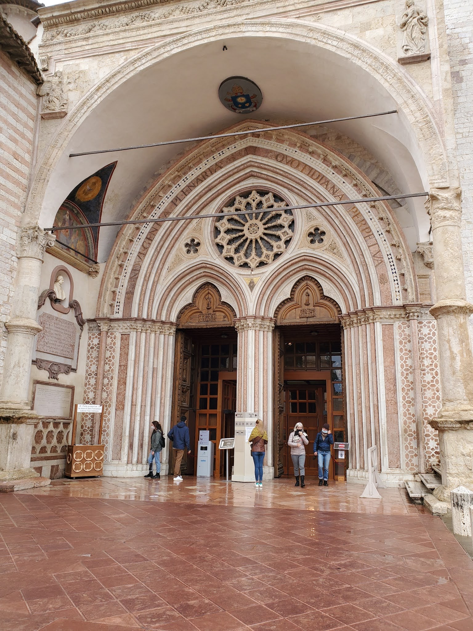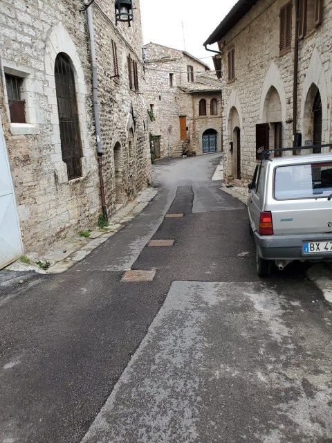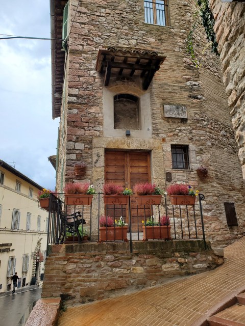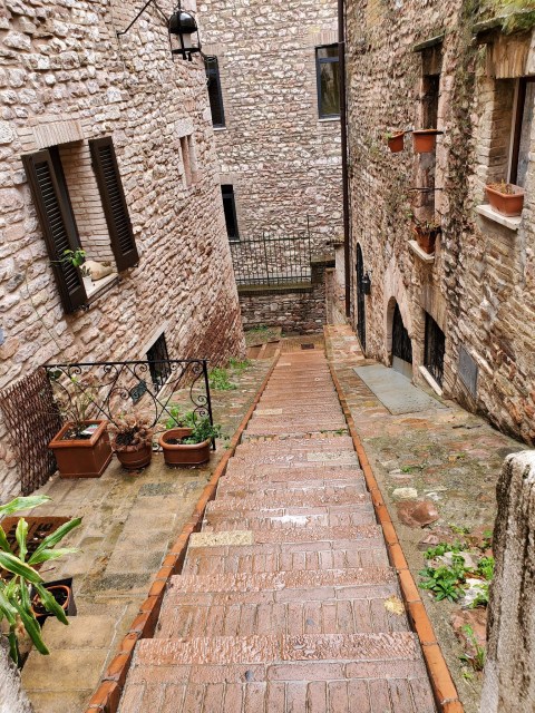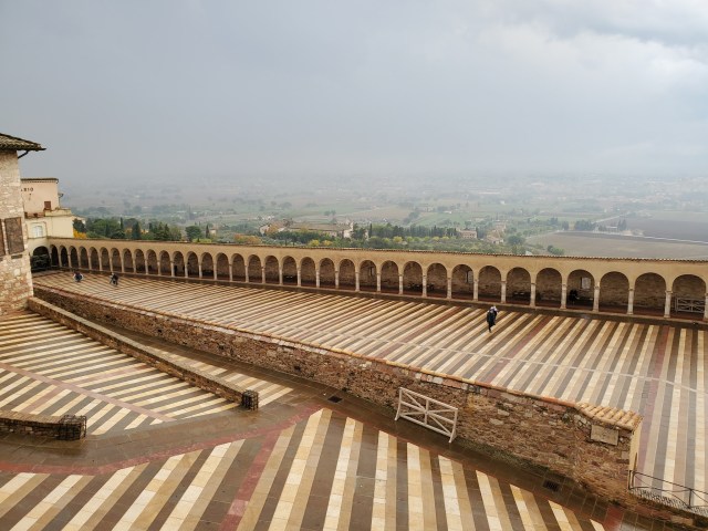 Our plan was to do a self-guided audio walking tour from the uppermost point down to the Basilica of San Francesco of Assisi. An old Roman amphitheater was the first highlight and then some fantastic winding cobblestone back alleys, but then came the rain. It was hard enough that continuing on wasn’t possible, so we made our way back to the main piazza to have lunch.