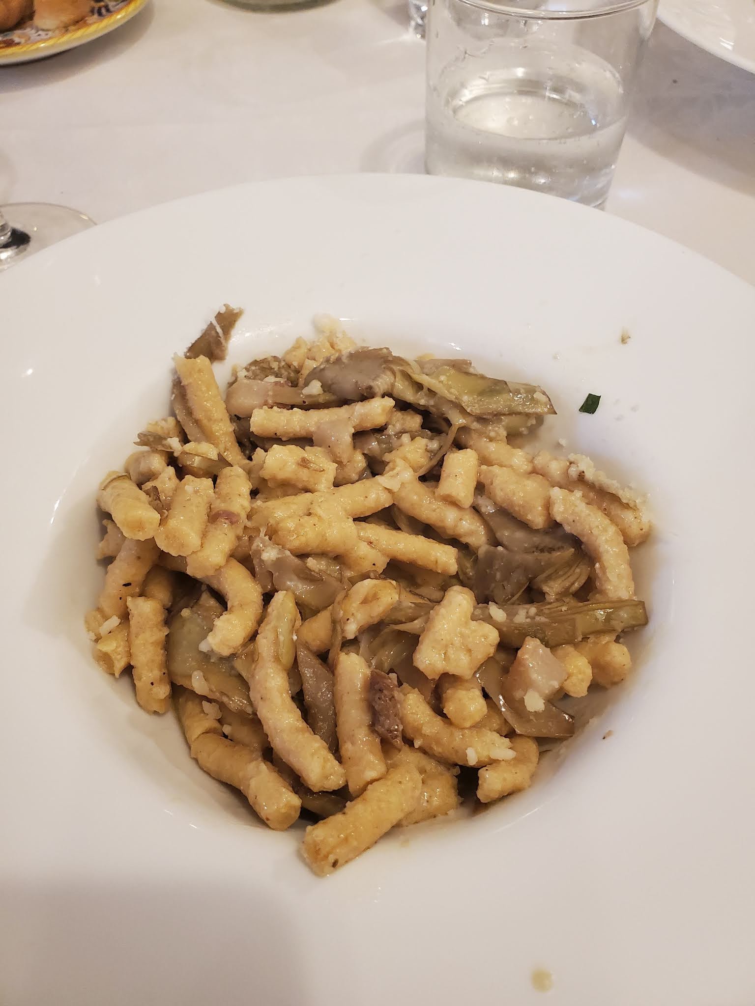 The dish isn’t pretty, but it was delicious. It’s a bread pasta with artichokes and guanciale.