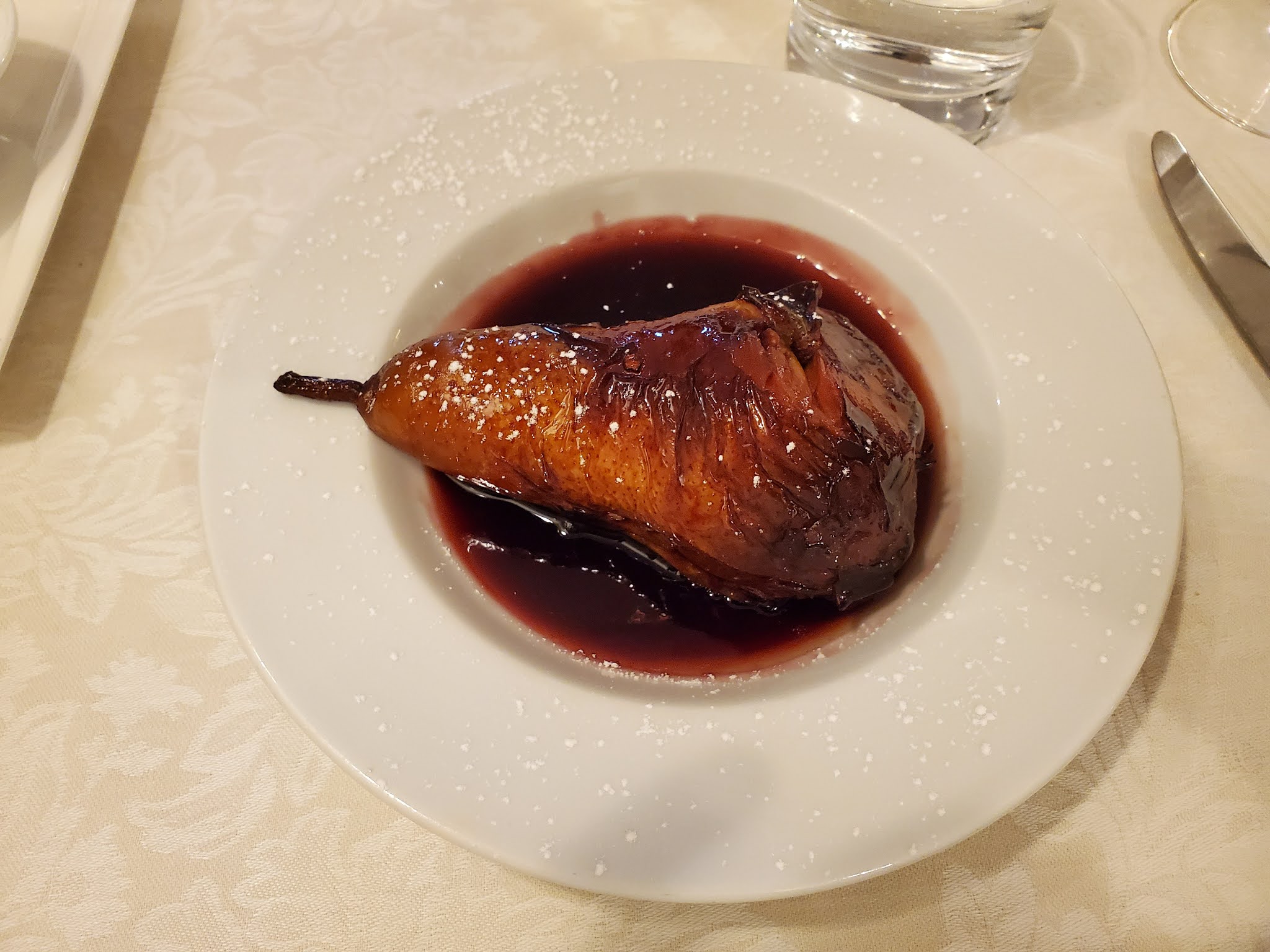 A pear poached in wine sauce, so beautiful and so good.