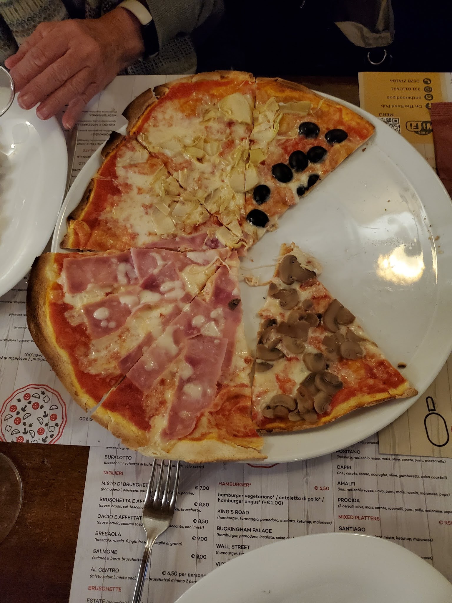 Bonnie was smarter with her order of a pizza with four kinds of toppings including a better ham, artichokes, mushrooms and olives — all split into quadrants. It was like sampling four pizzas.