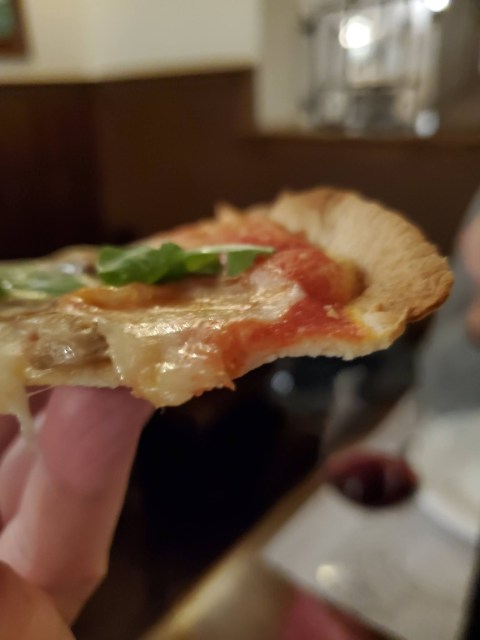 The thinness of the crust is impressive. It’s as thin as a tortilla and crisp.