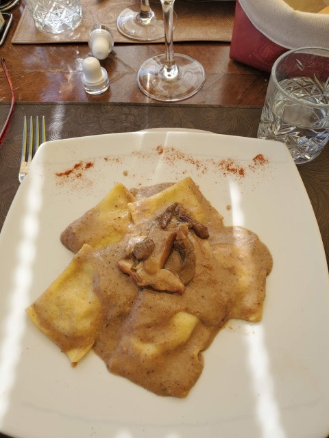 Tortello with porcini mushrooms and stuffed with sausage cream for both Emily and me. Not pretty, but very good.