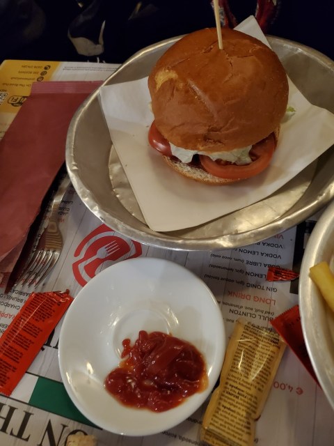 Emily’s not as much of a fan of pizza as the rest of us, so she ordered a hamburger.