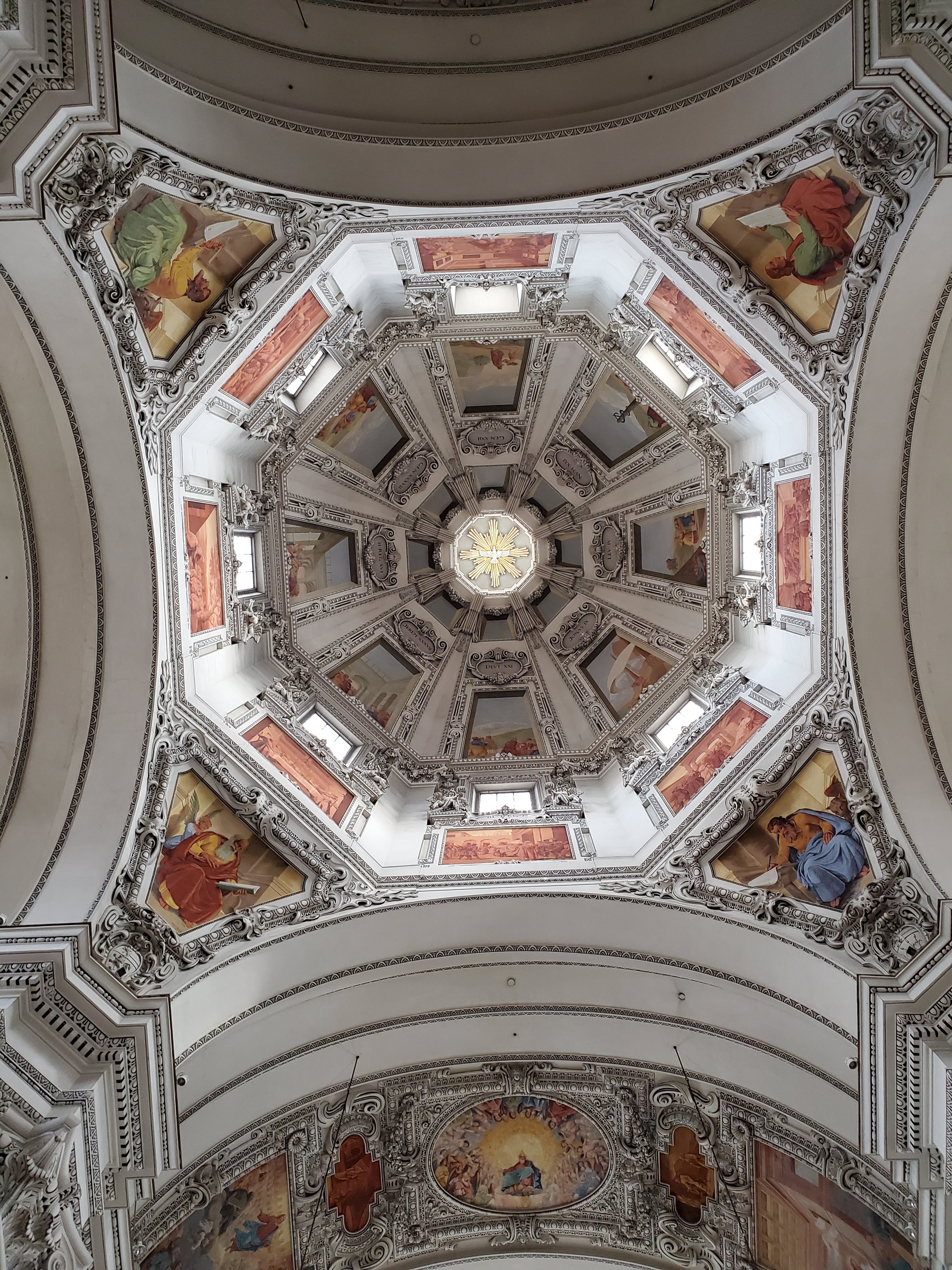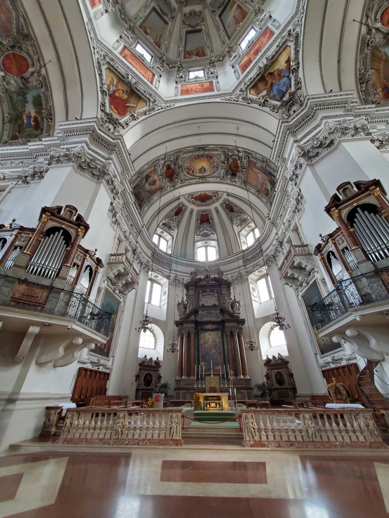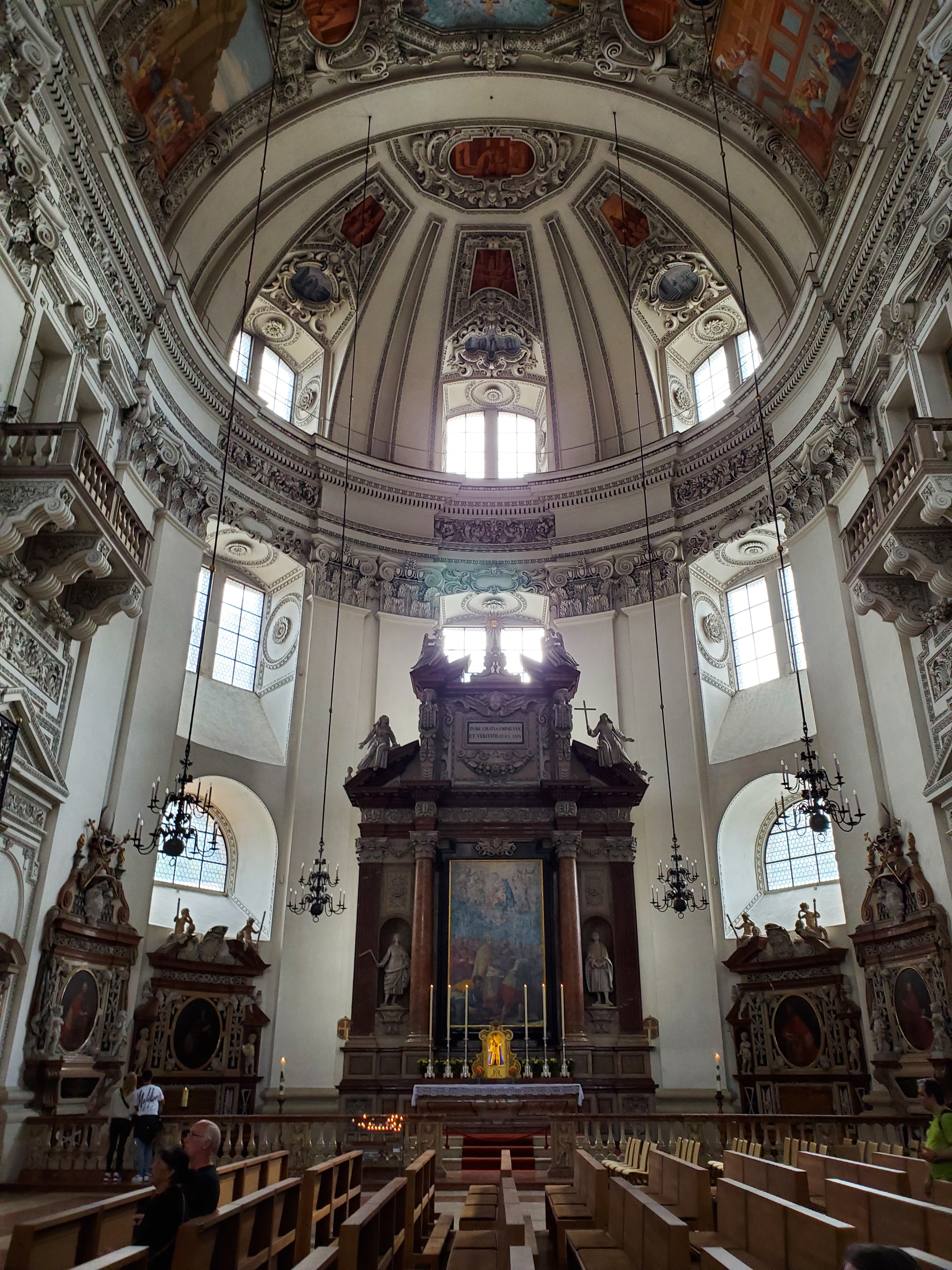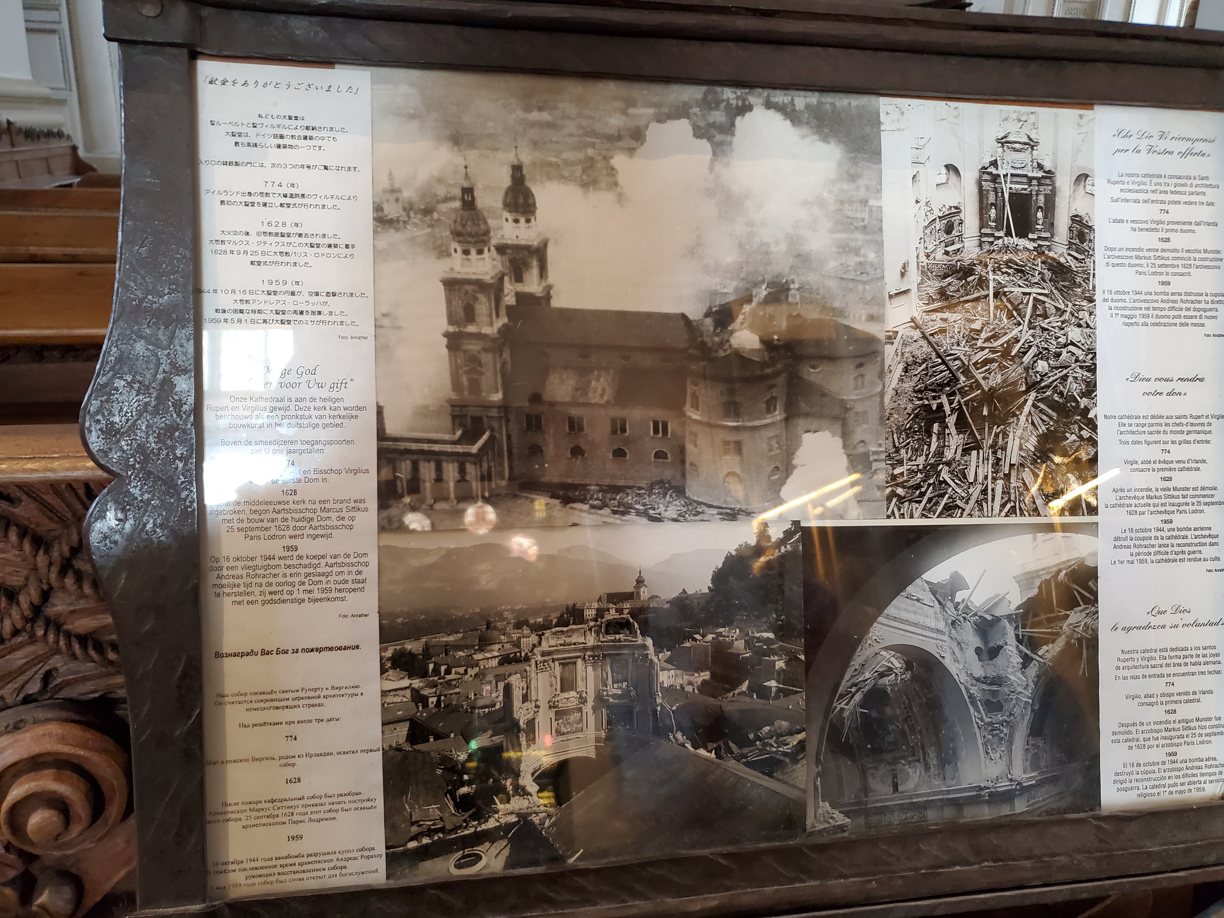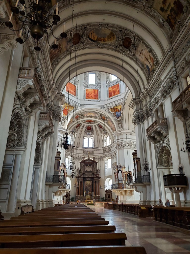 The Italian influence came to the city in the 1600s when a Prince-Archbishop who had been raised in Rome was in charge. The cathedral had burned down just before he rose to power so he had a chance to build it in Italian style and it is one of the first Baroque buildings north of the Alps. There are three entrance gates and each has a date: 774 marking the consecration of the first church on the site, 1598 when the church burned, and 1959 when it was repaired after WWII bombs damaged it. Today’s Cathedral is beautiful inside and it’s big, more than 300 feet long and 250 feet tall. Under the dome at the front are four organs and Mozart was once the organist, until he was dismissed (!). He was baptized and grew up in this church.