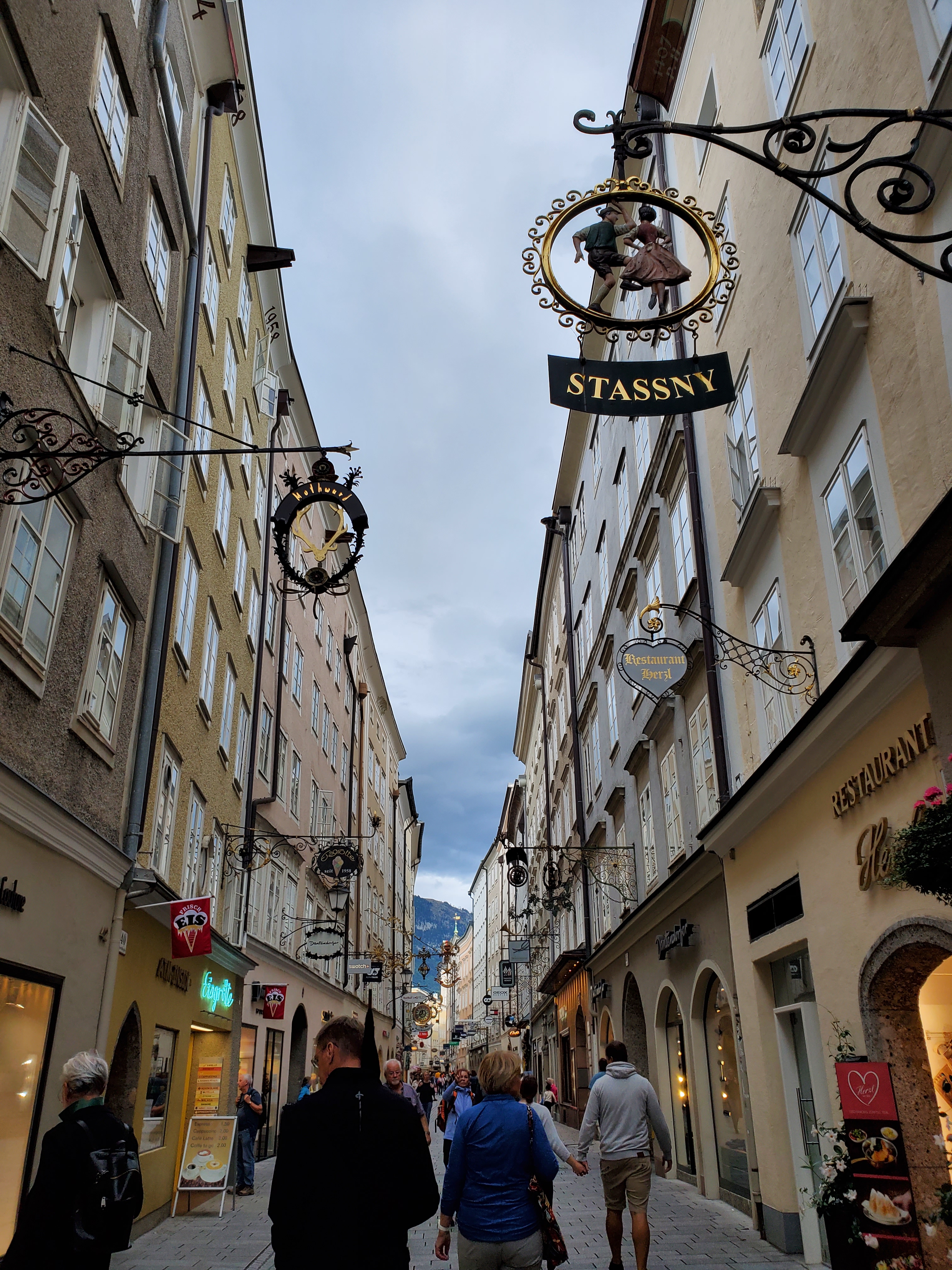 We finished the walk along the main street of Old Town, Getreidegasse. It’s lined with wrought iron signs and buildings from the 15th Century that are now occupied by attractive shops and restaurants.