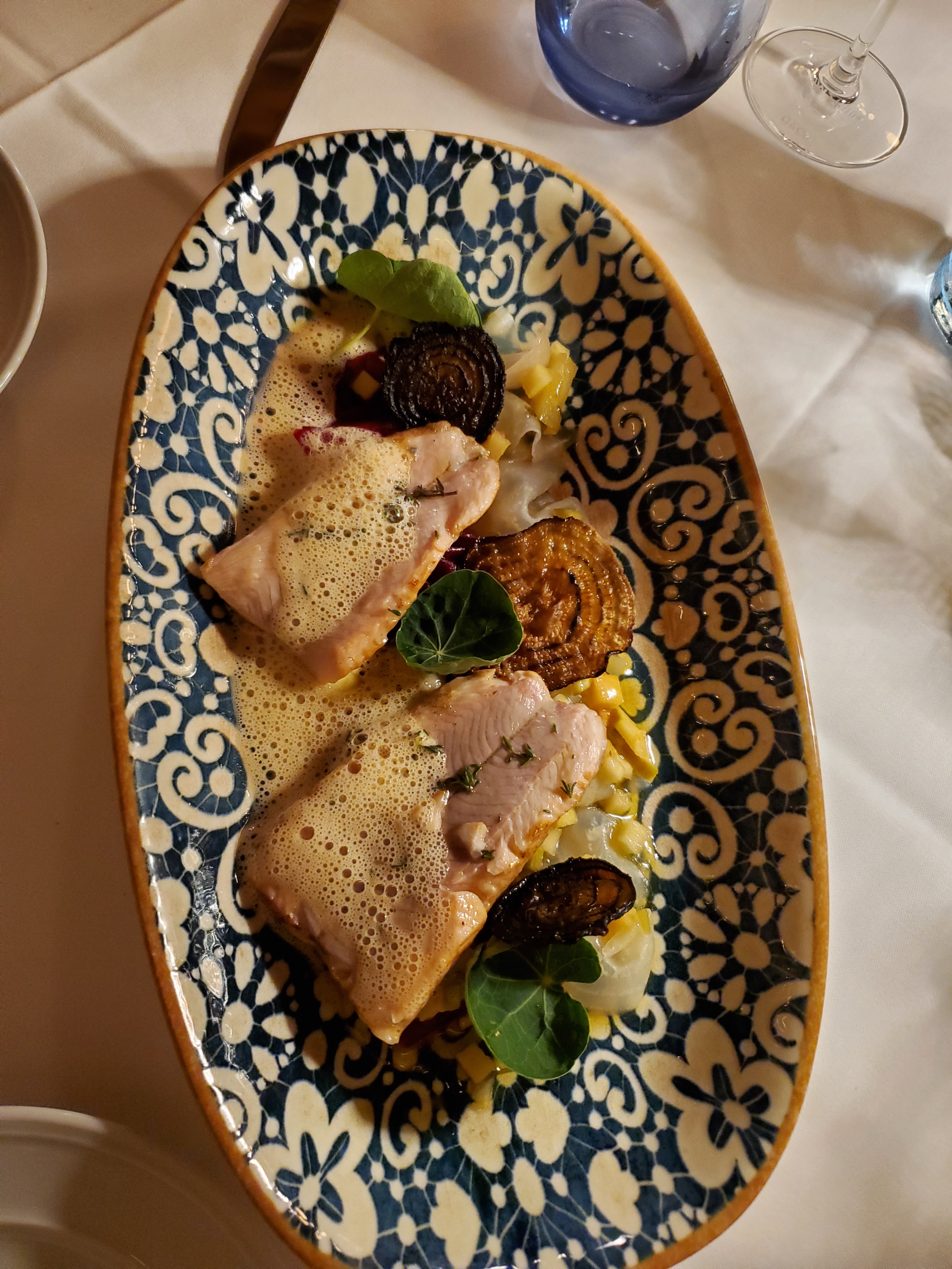 This was the appetizer and I’m not sure it looks as delicious as it was. That’s trout with a lemony apple foam, some diced apples, shaved apples, beets and parsnips. Betsy is still working out how those thinly shaved apple slices were prepared.