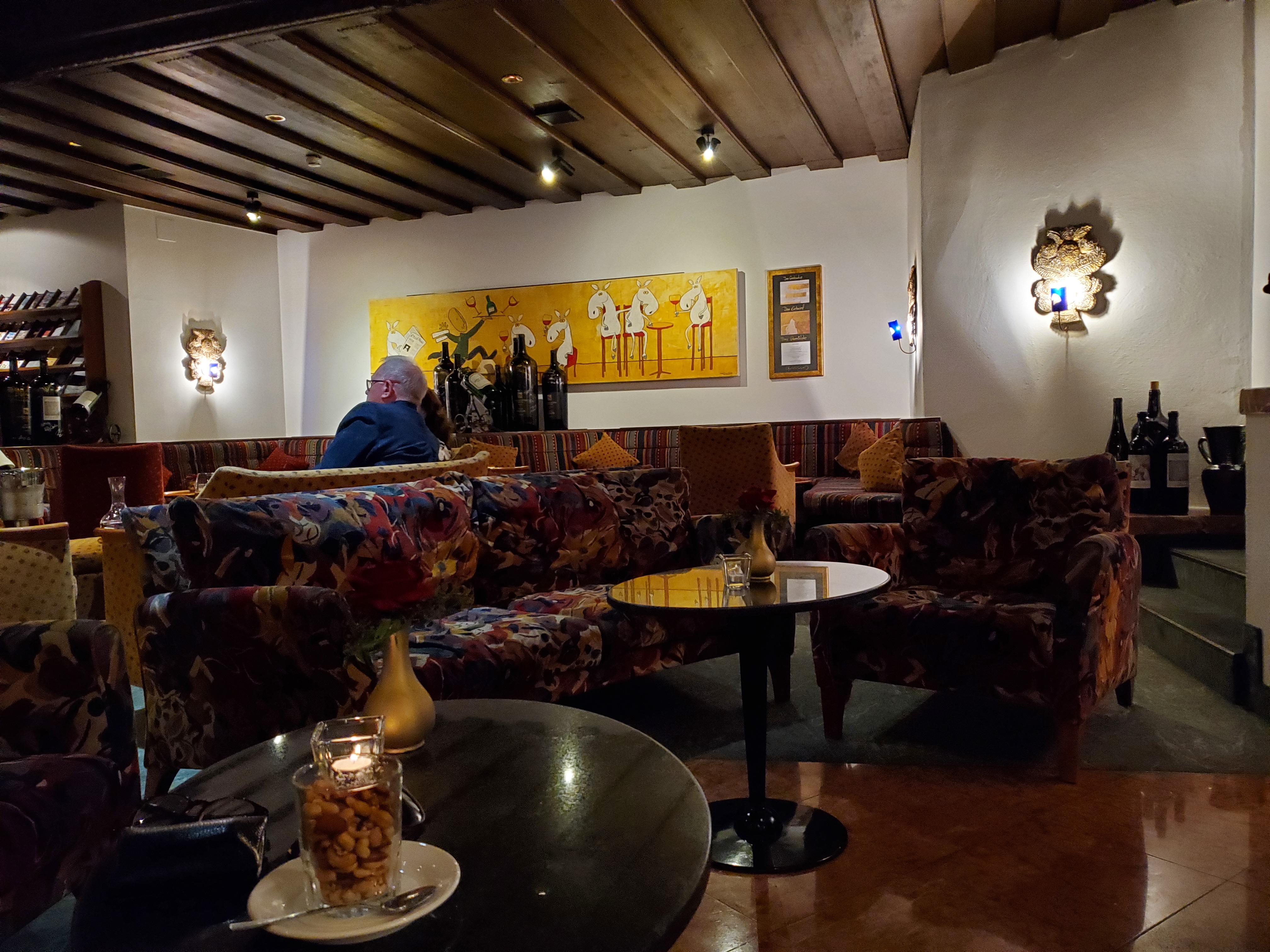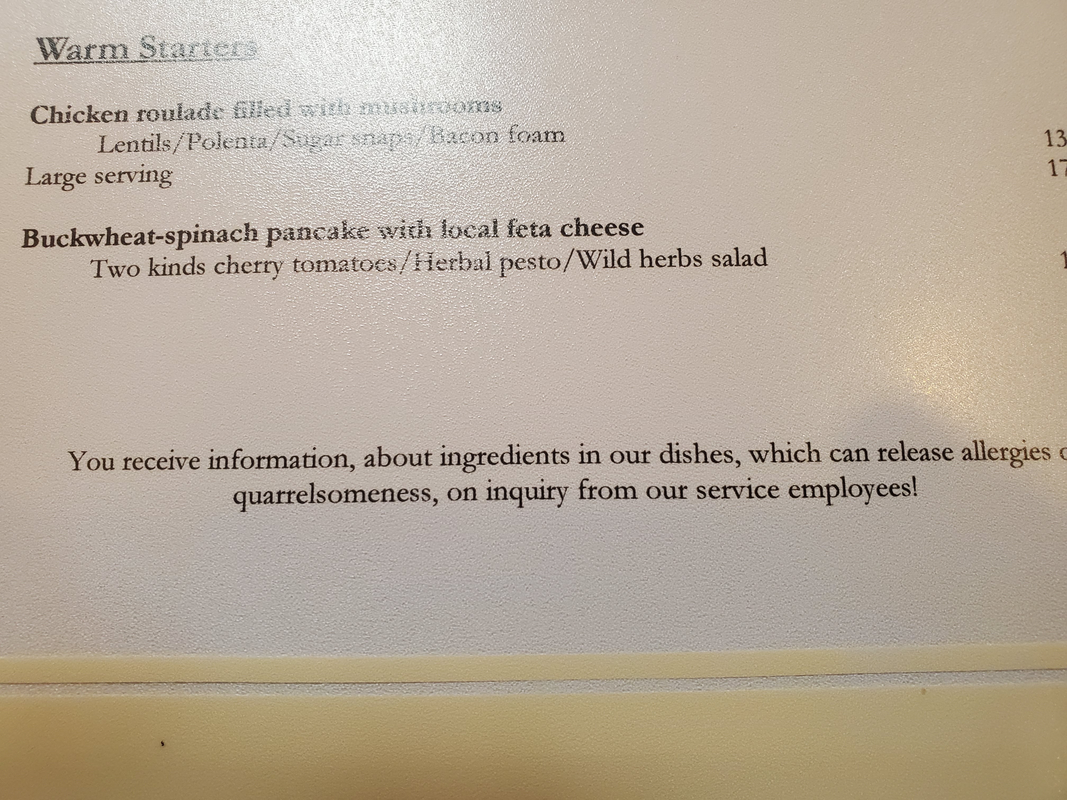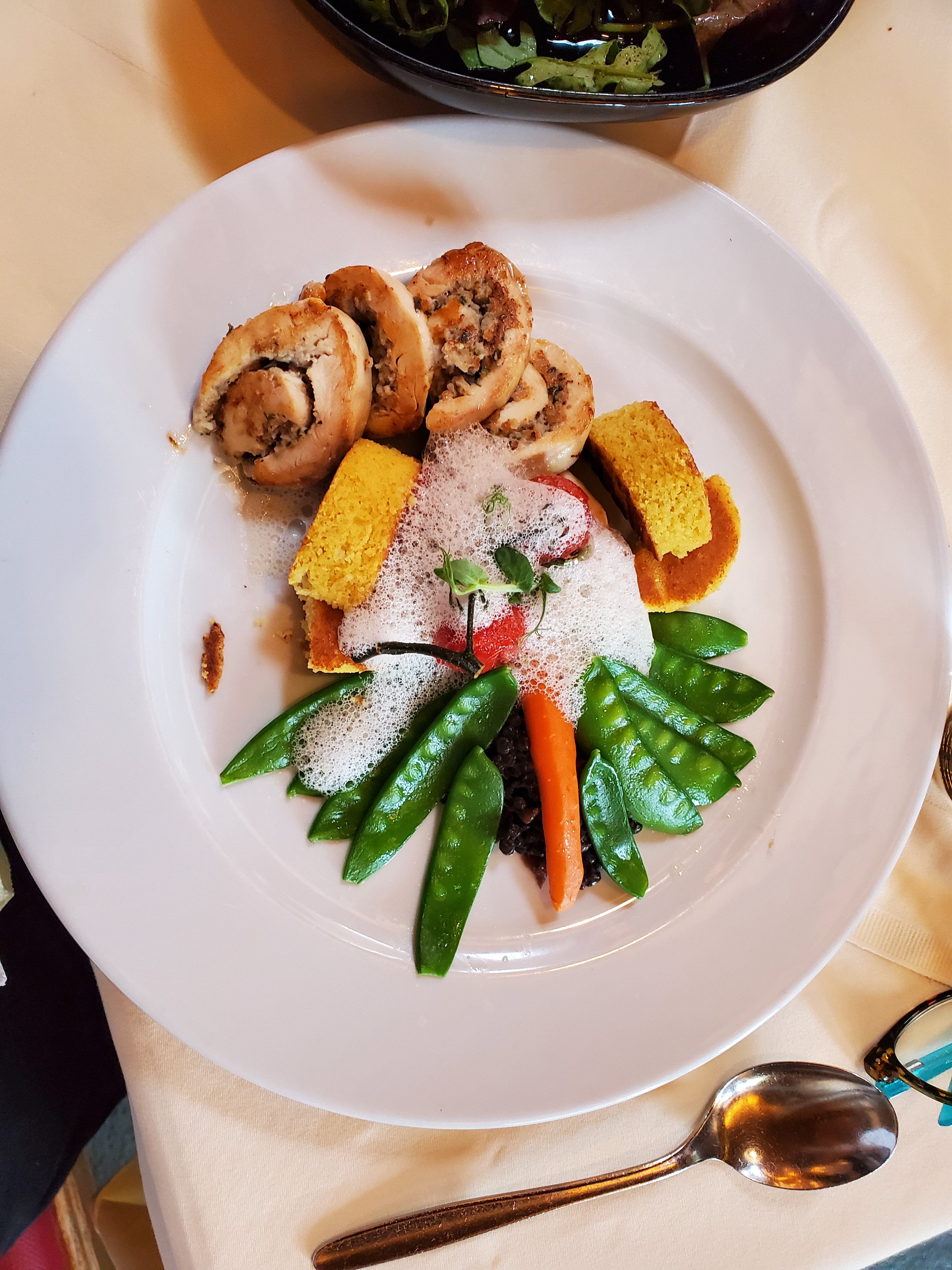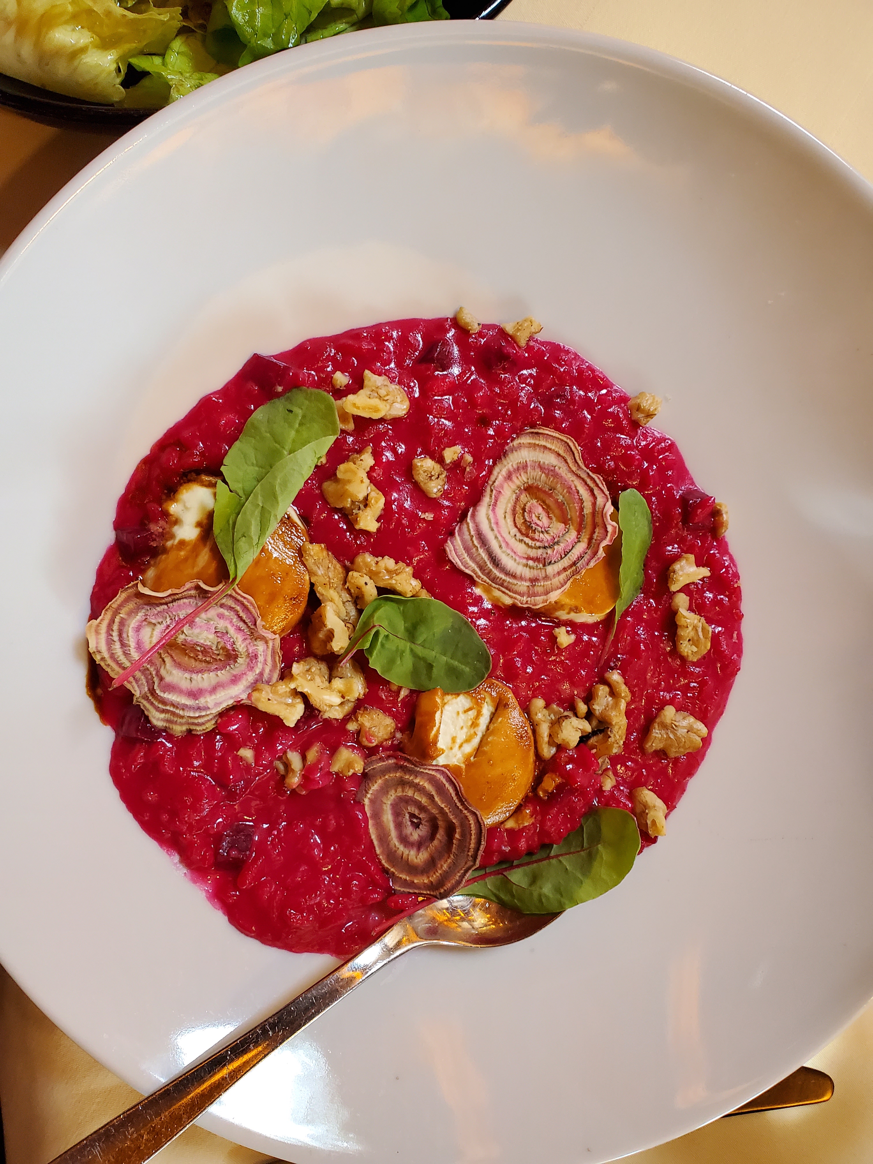 After settling in, we went to the hotel restaurant for lunch. It’s kind of fancy and pricey. The clientele is clearly senior citizens, people more senior than us. It is the first time in a long time that we’ve been the youngest people in a room full of people. Apparently all those old people had good taste because the food was really good. Betsy had beet risotto, of course. It had sheep’s cheese, walnuts, beet crisps and beet leaves. I had a chicken roulade dish with snow peas, lentils, tomatoes, polenta and a bacon foam, which sounded off-putting, but was really good.
