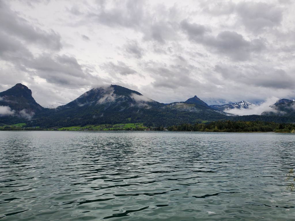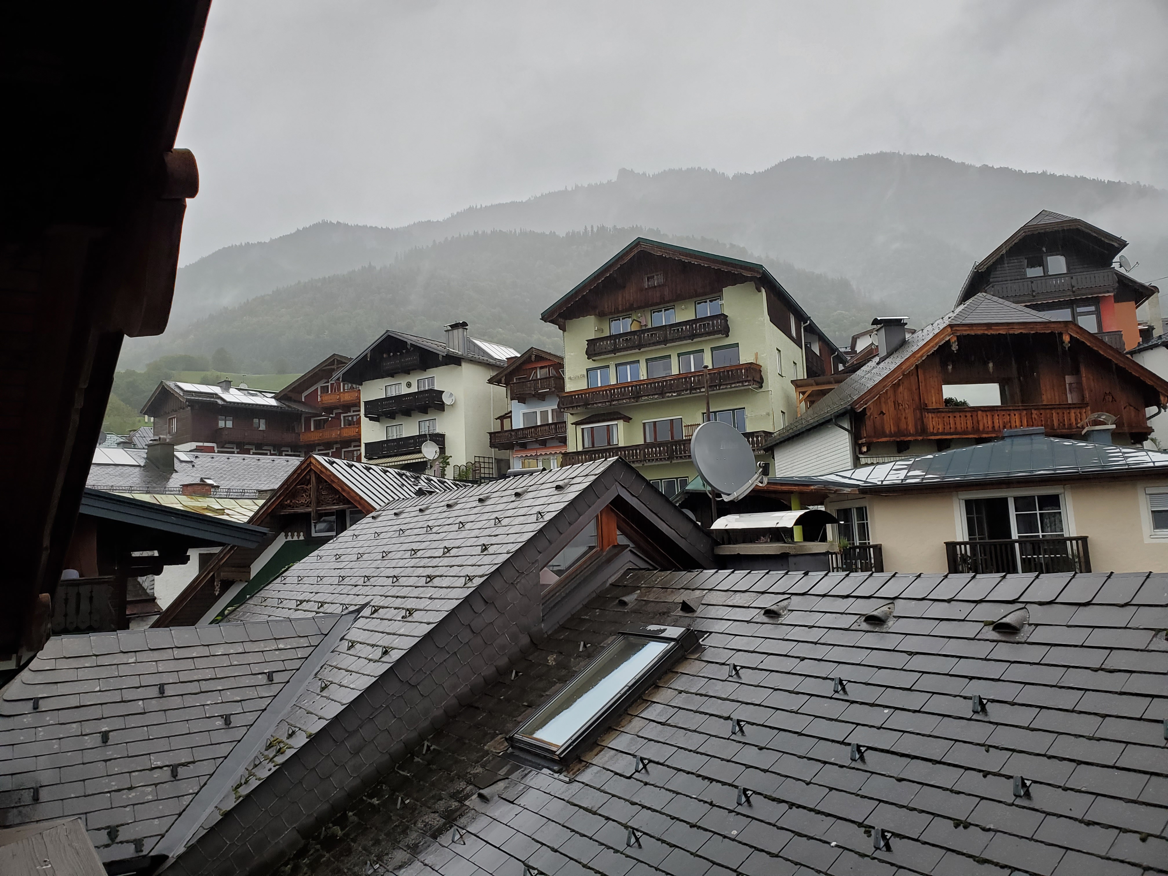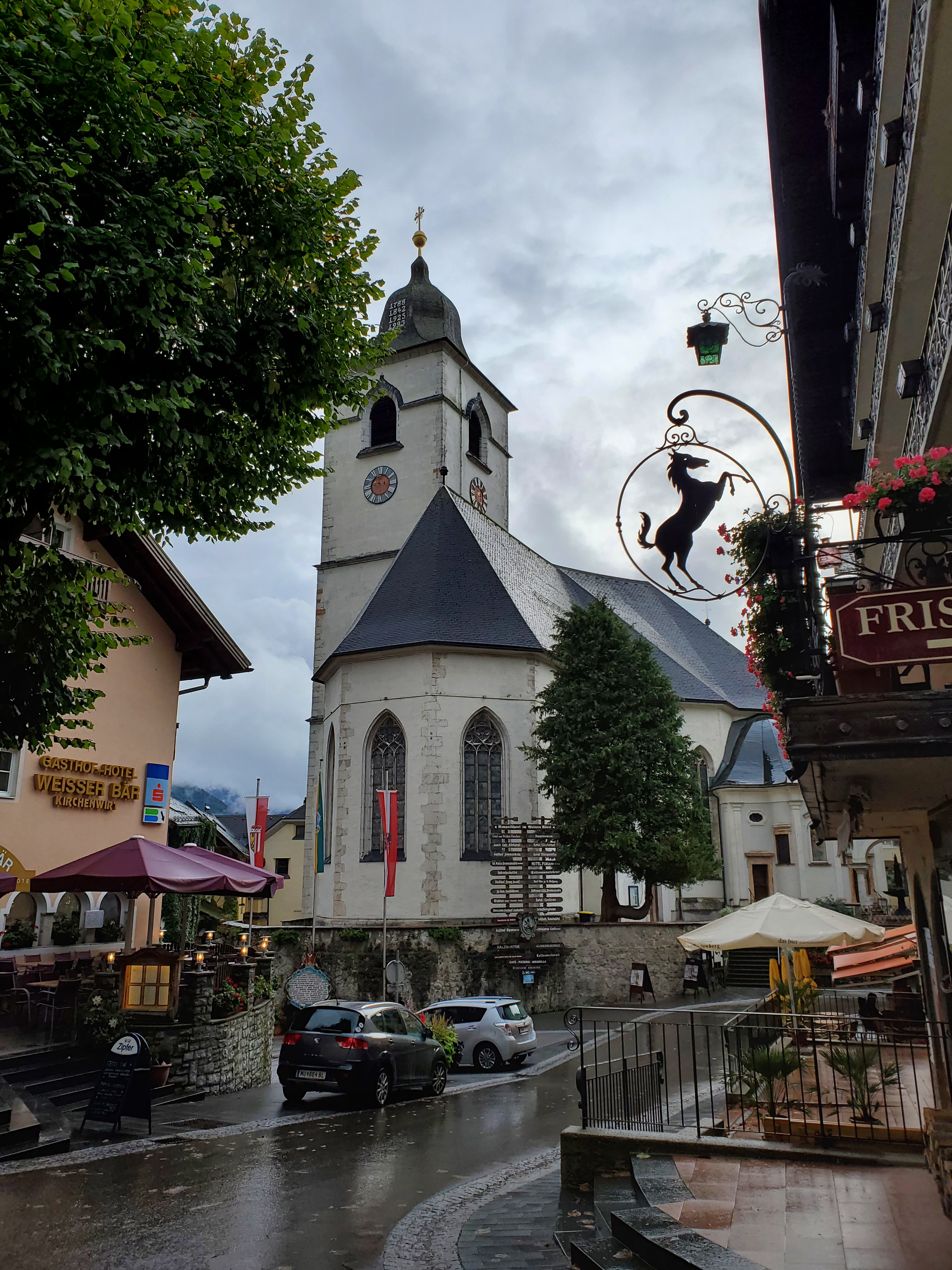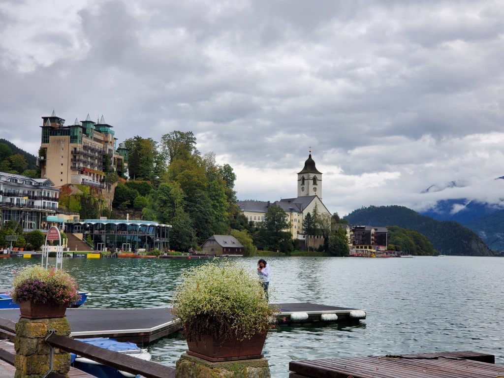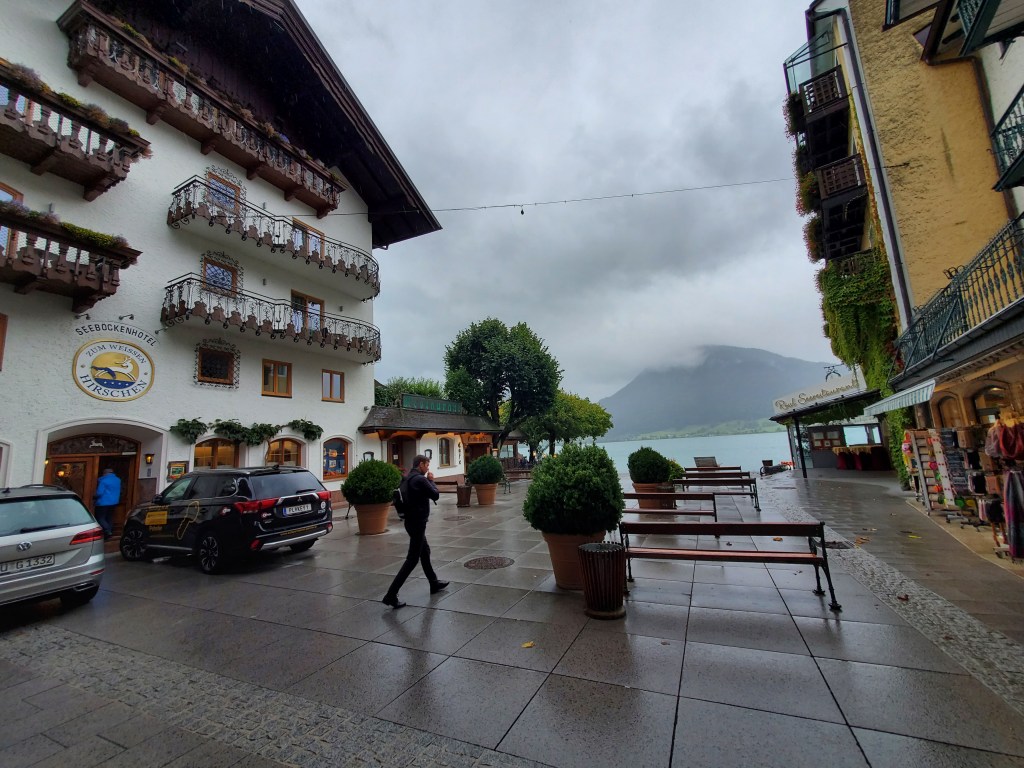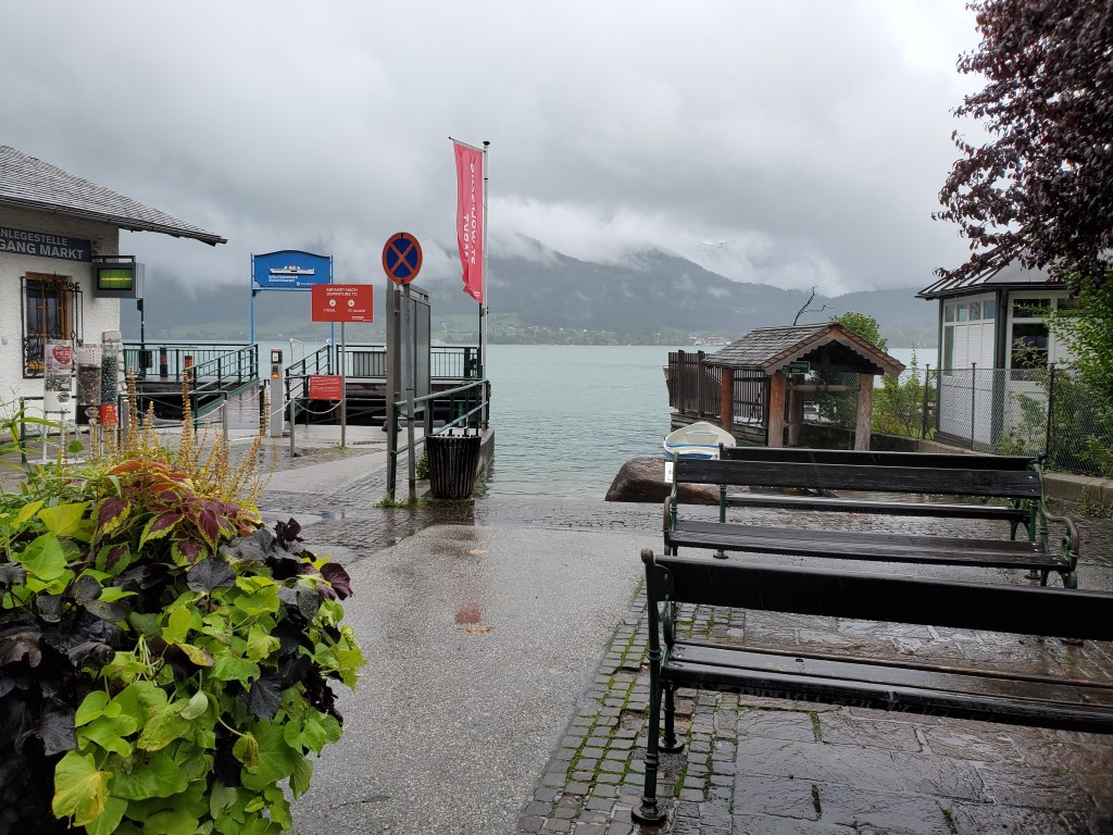 Late afternoon, we bundled up in our raincoats and went exploring. We saw a church that anchors the village — the Pilgrimage Church — just around the corner and had to go in for a look. It was impressive. We’ve been to a lot of churches all over Europe and this one stands out for its ceiling and ornamental altars. Legend has it that Bishop Wolfgang was living as a hermit and decided to build a church. The story goes that he threw an ax down the mountain with a vow to build the church where it landed. It appears to have been in a pretty good spot, right in flat land on the water’s edge. The legend also says Wolfgang enlisted the help of the devil to build the church by promising him the soul of the first living being to enter the church upon its completion. However, Wolfgang tricked the devil by making sure a wolf was the first to enter. Bishop Wolfgang was canonized not long after his death and the lake and town took his name.