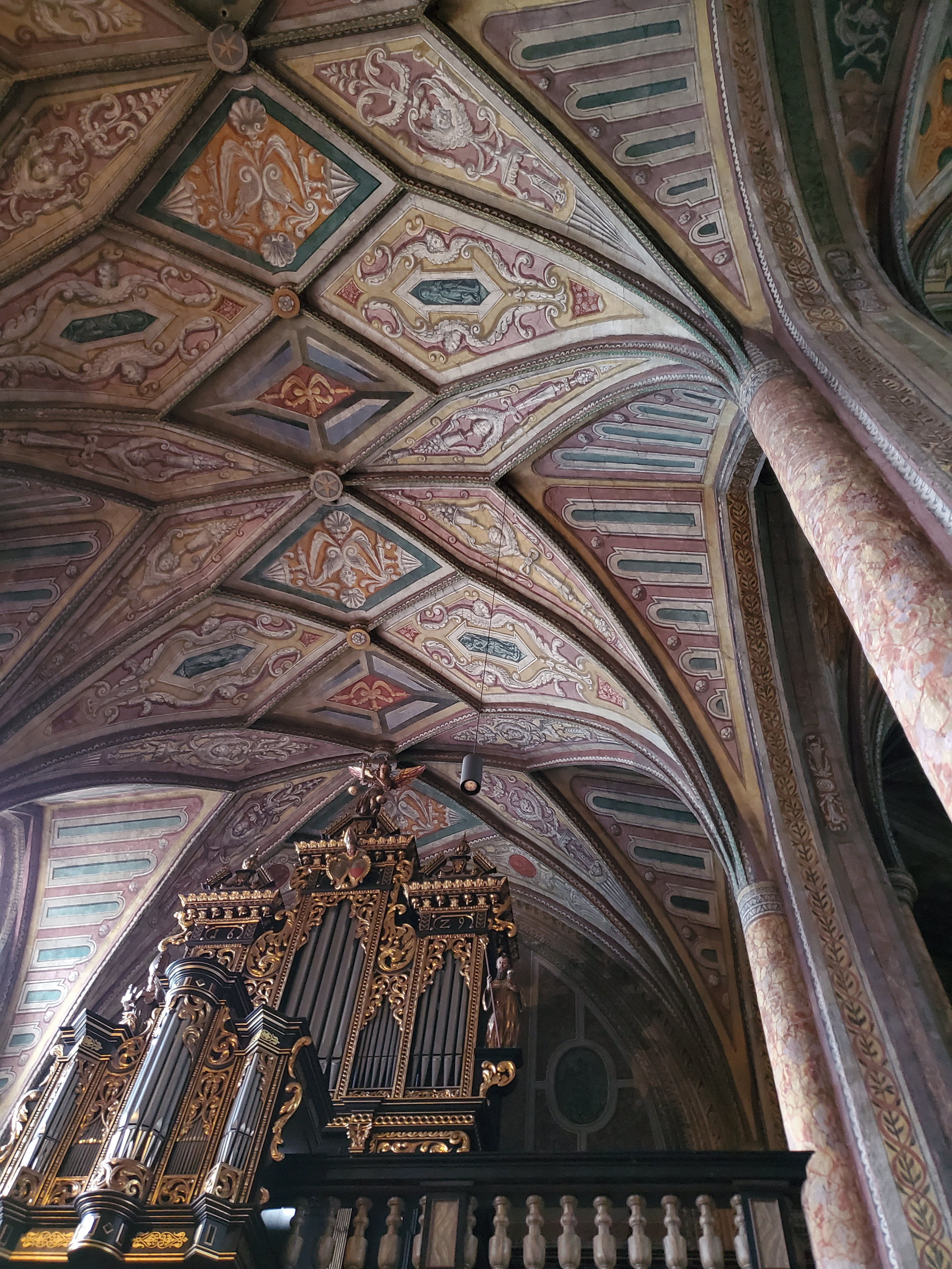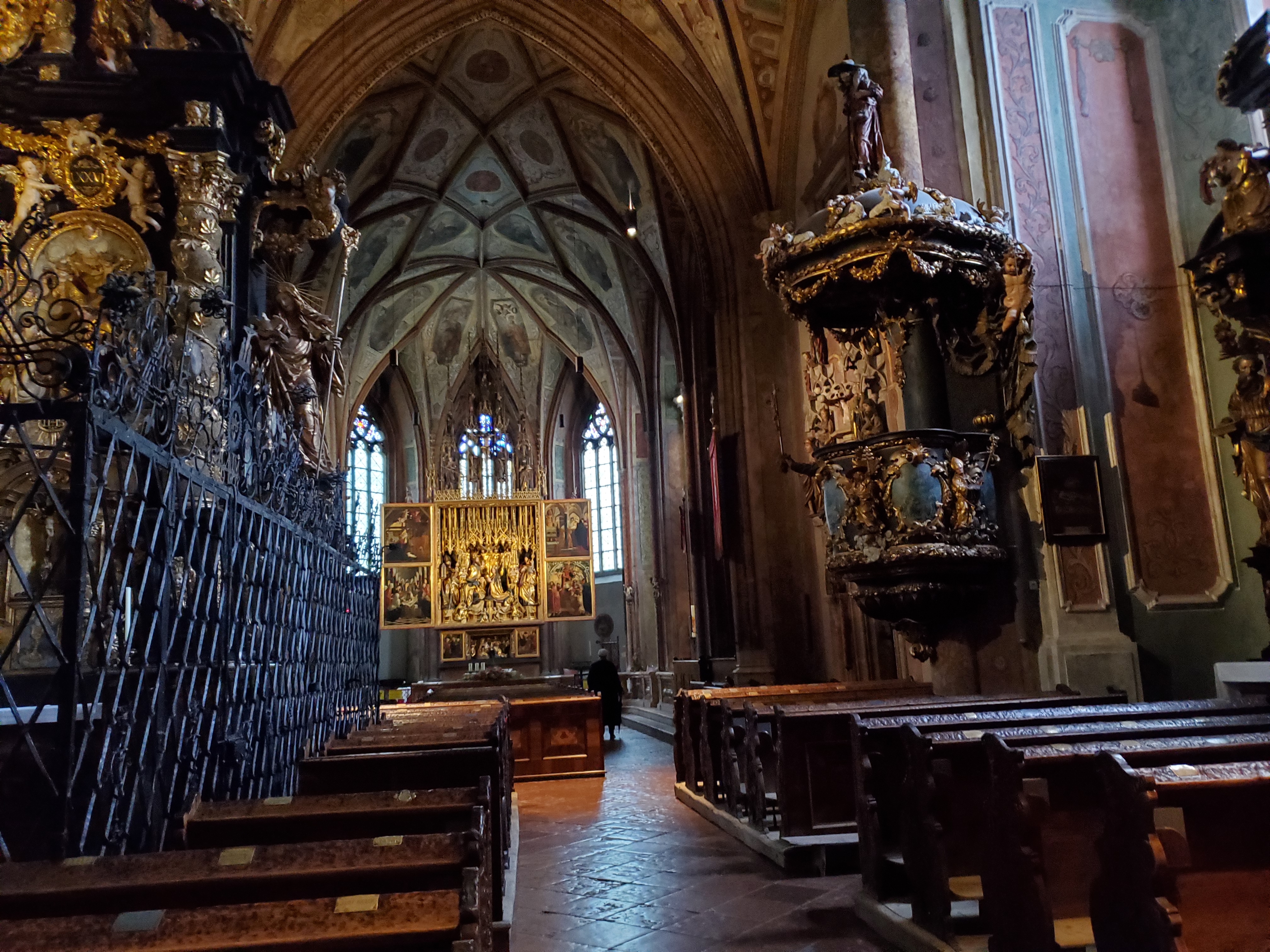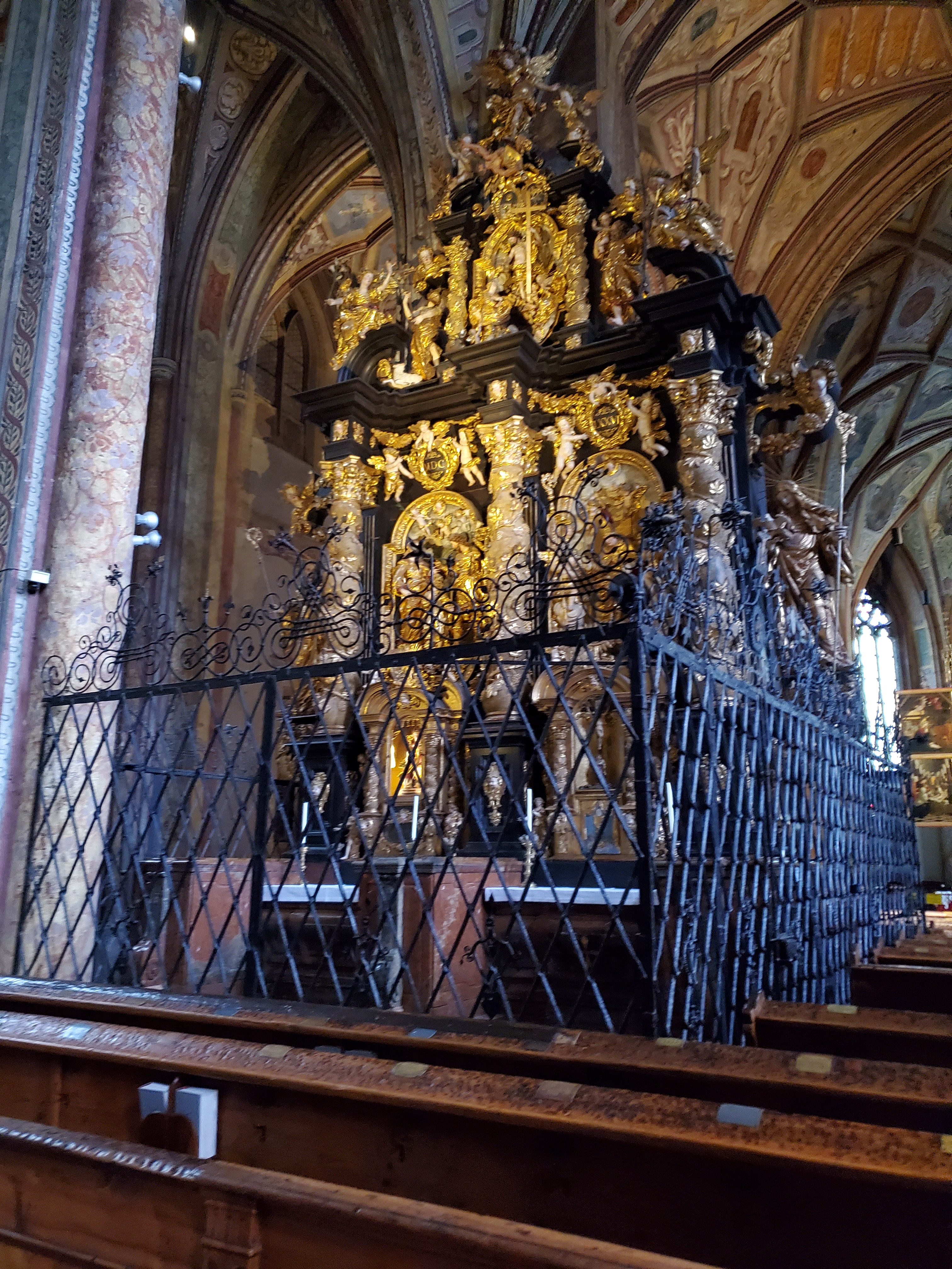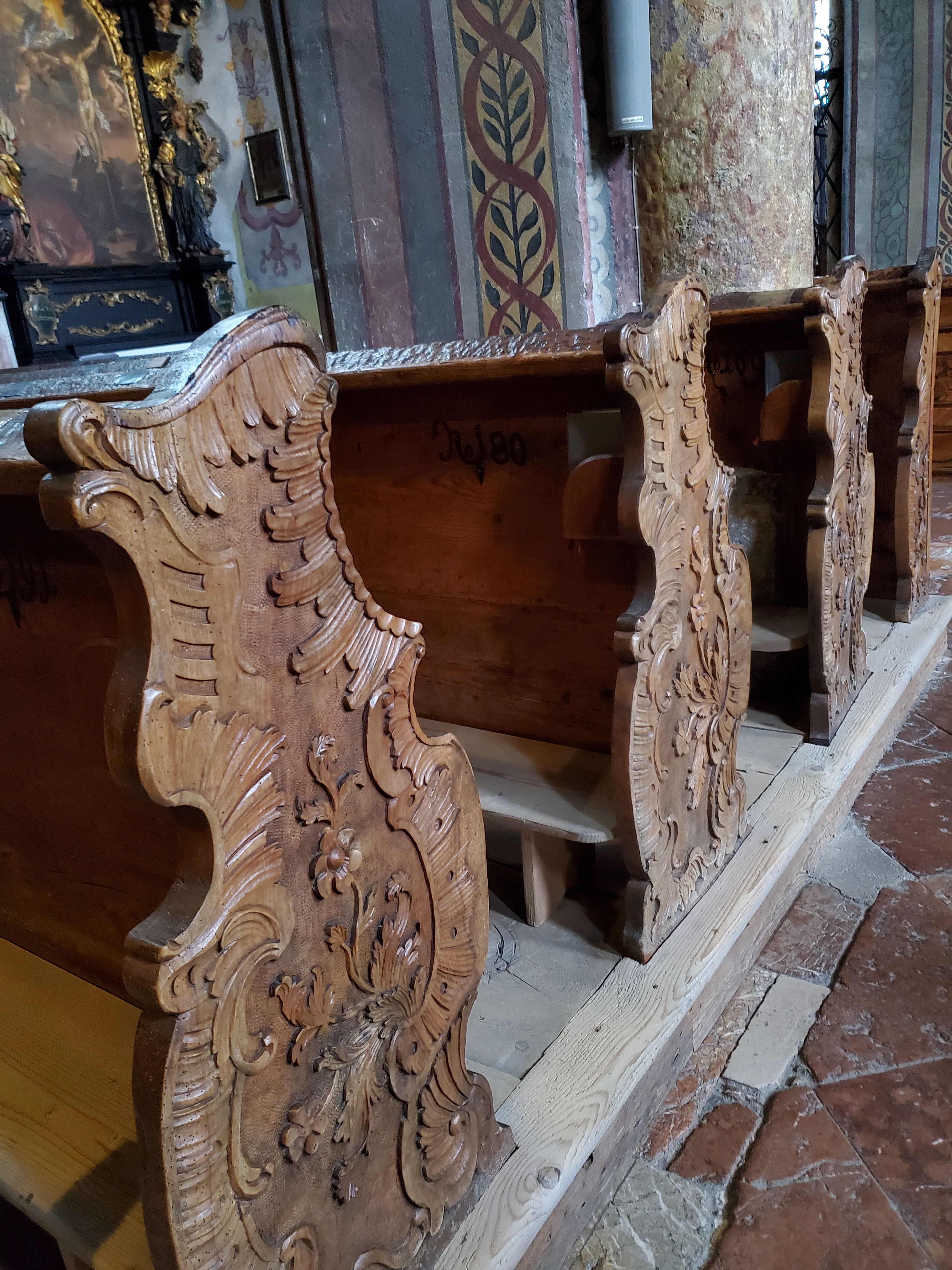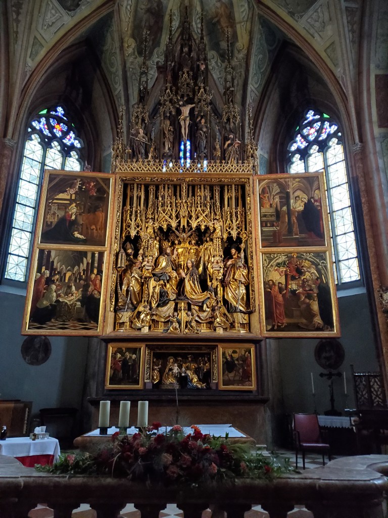 Late afternoon, we bundled up in our raincoats and went exploring. We saw a church that anchors the village — the Pilgrimage Church — just around the corner and had to go in for a look. It was impressive. We’ve been to a lot of churches all over Europe and this one stands out for its ceiling and ornamental altars. Legend has it that Bishop Wolfgang was living as a hermit and decided to build a church. The story goes that he threw an ax down the mountain with a vow to build the church where it landed. It appears to have been in a pretty good spot, right in flat land on the water’s edge. The legend also says Wolfgang enlisted the help of the devil to build the church by promising him the soul of the first living being to enter the church upon its completion. However, Wolfgang tricked the devil by making sure a wolf was the first to enter. Bishop Wolfgang was canonized not long after his death and the lake and town took his name.