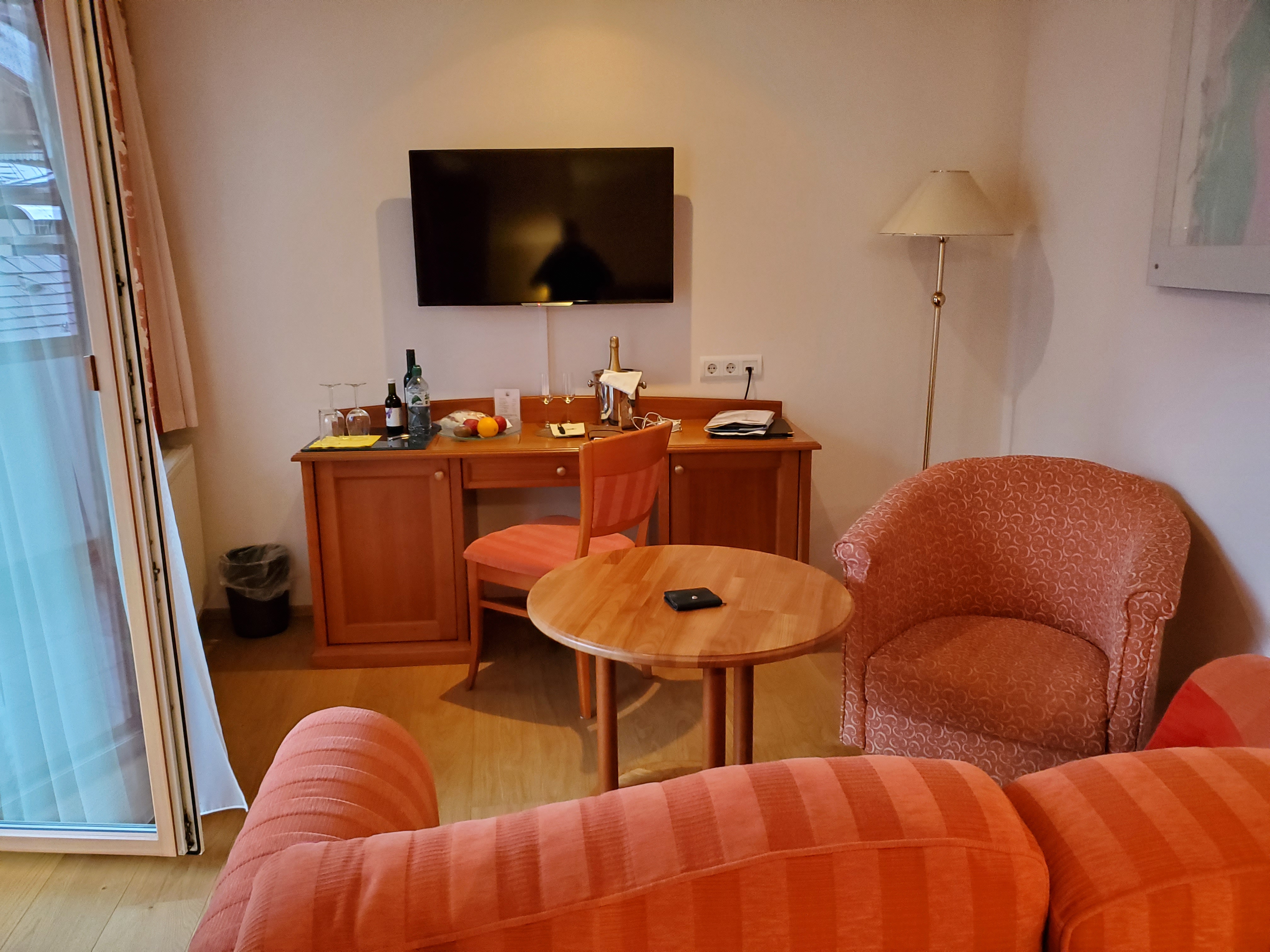 We like our room. It’s big and comfortable and the floors are heated, a nice touch. We have a little outdoor space which we may not use, but at least we can open the door and get some cool, fresh air in the room.