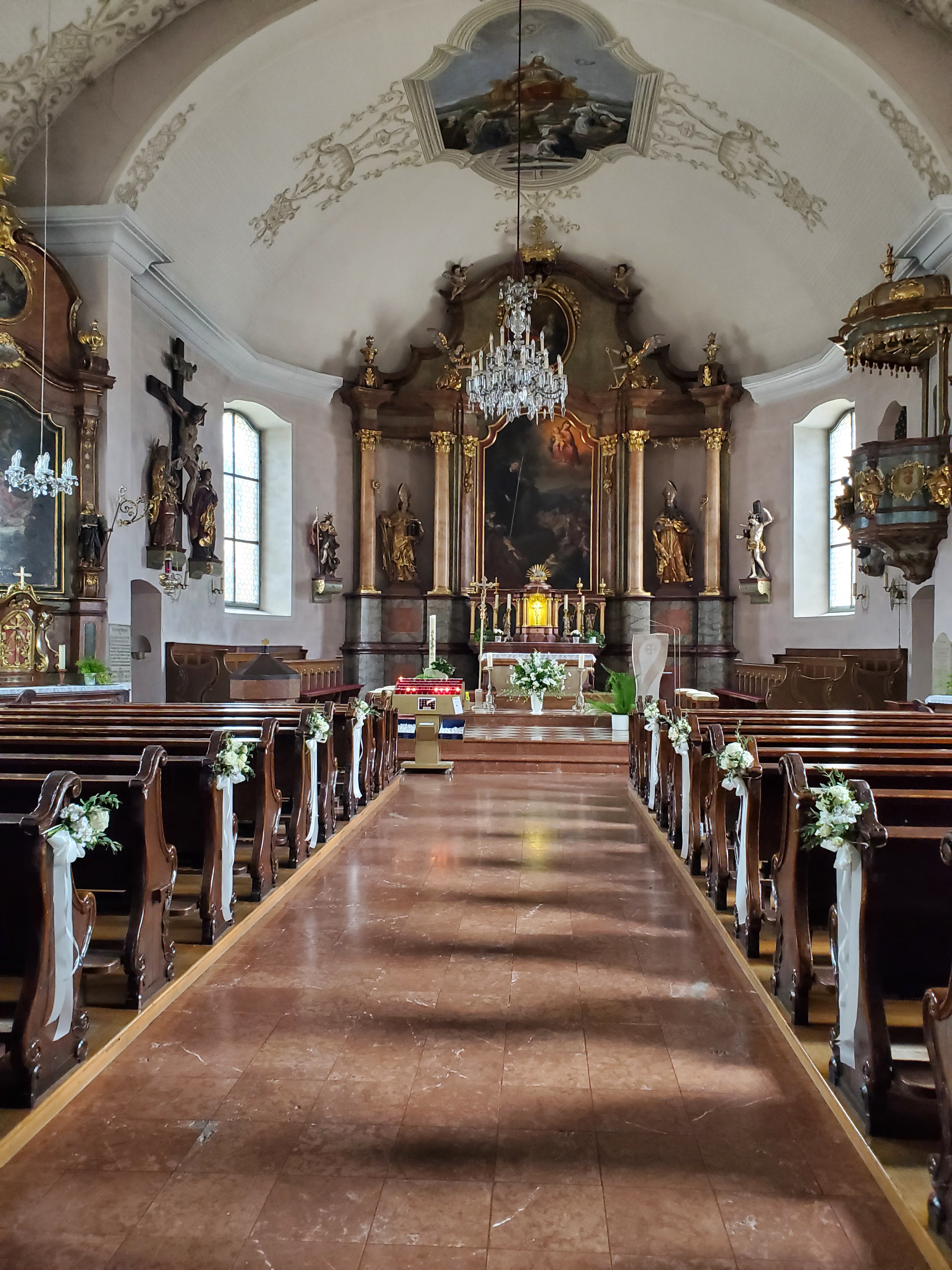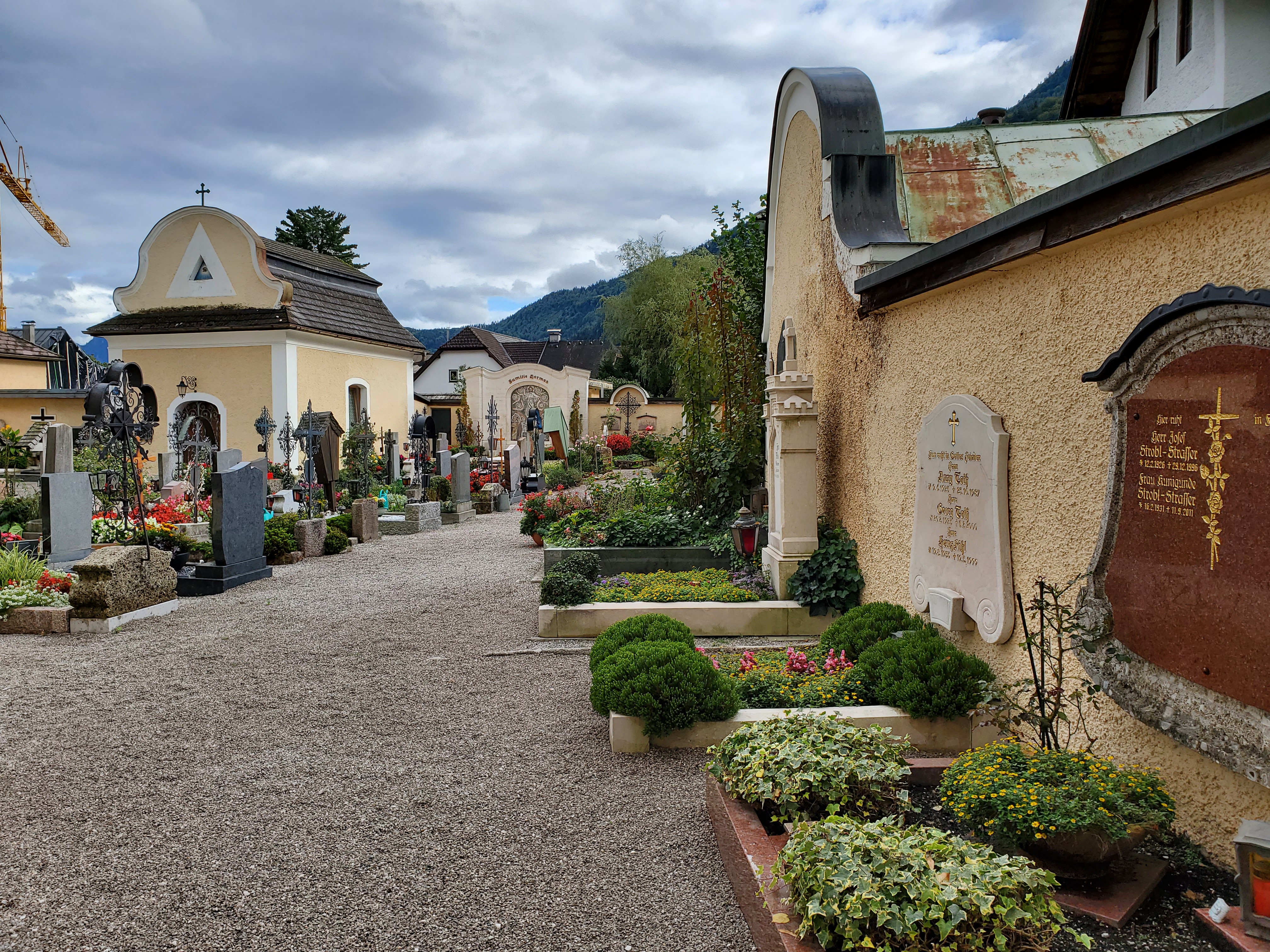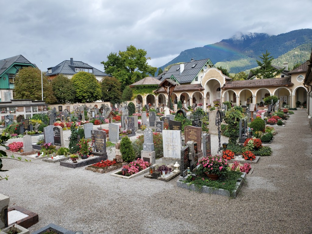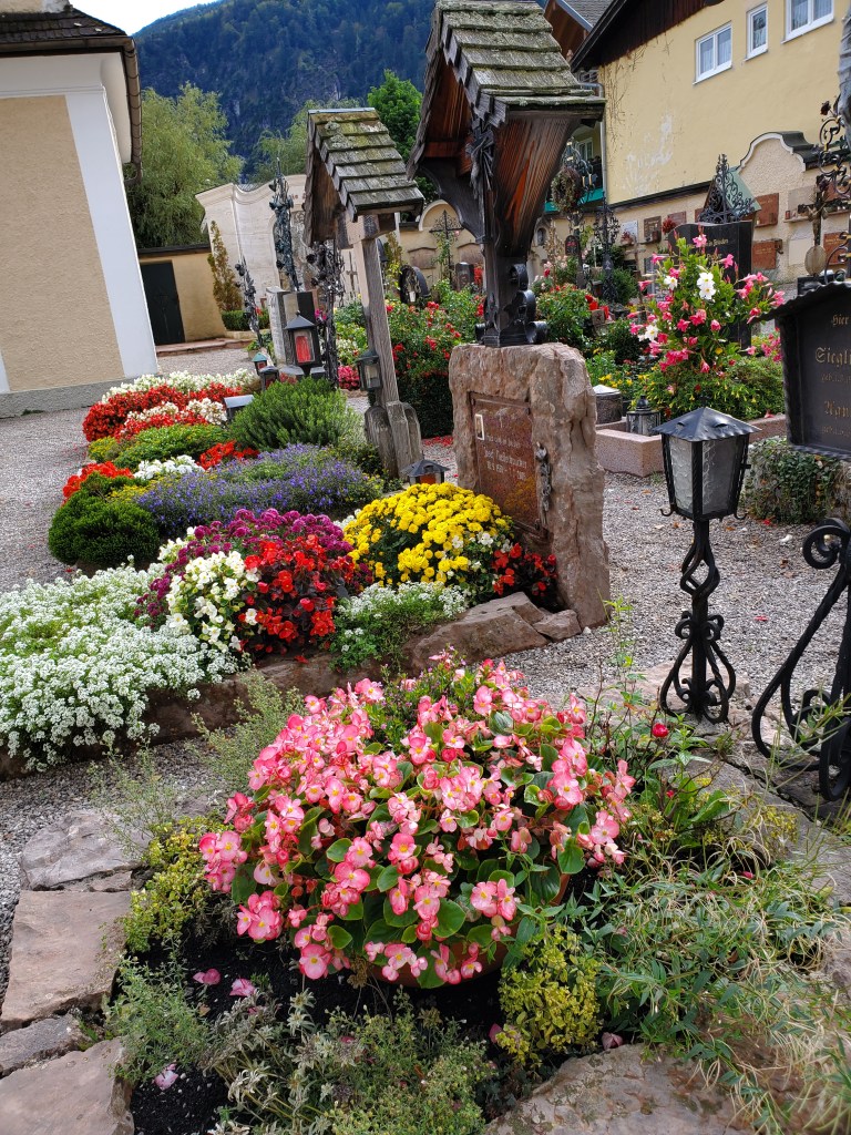We spotted a church. We are drawn to churches like bees to honey because they are so interesting and always have such great architecture. This one had a cemetery attached and it was a lot like the one we saw in Salzburg. Families keep the graves like mini-gardens with such beautiful flowers.