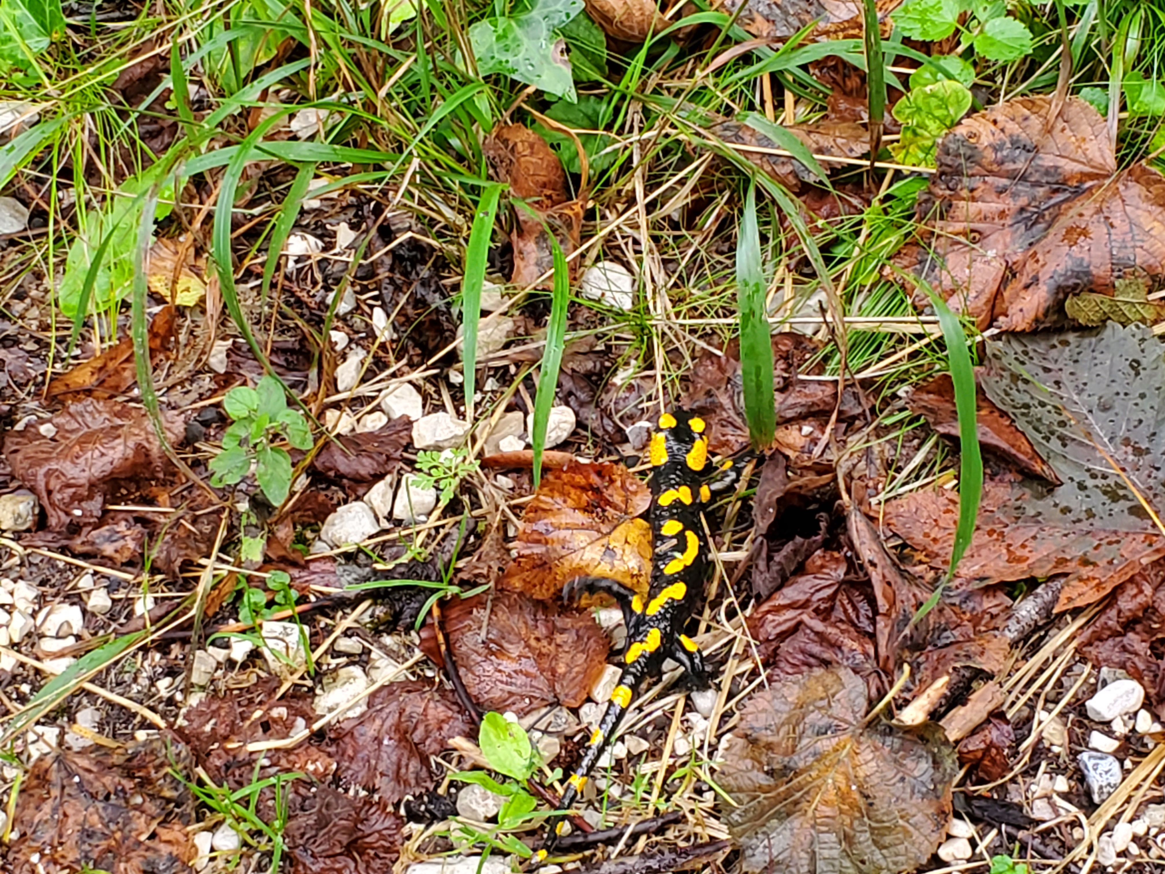 Betsy spotted something interesting moving in the grass, black with bright yellow markings. We looked it up later and learned it is a fire salamander. It was big and slow, but we still didn’t want to get too close.