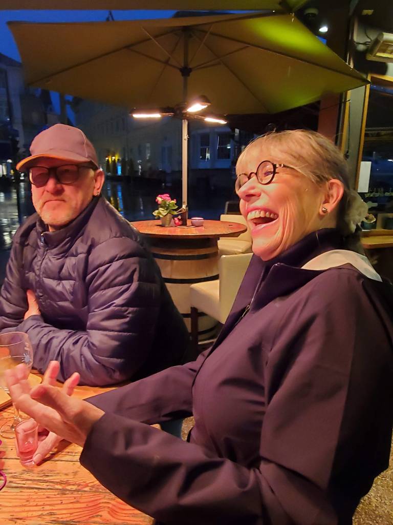Suddenly, the rain started falling in torrents and Betsy’s little umbrella and my raincoat weren’t doing the job. We ran for shelter at a little sandwich cart that had an awning and some large patio umbrellas. Since we were taking up their space, we decided to buy something to support their business. The owner suggested we try a young wine that’s only available a few weeks out of the year, Sturm (pronounced storm).